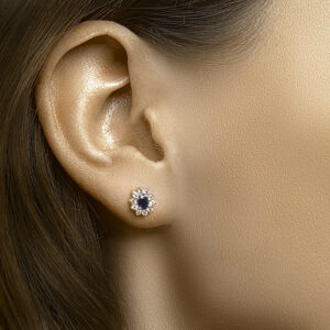 oorknoppen saffier en diamant 0.16 ct halo 14K geelgoud