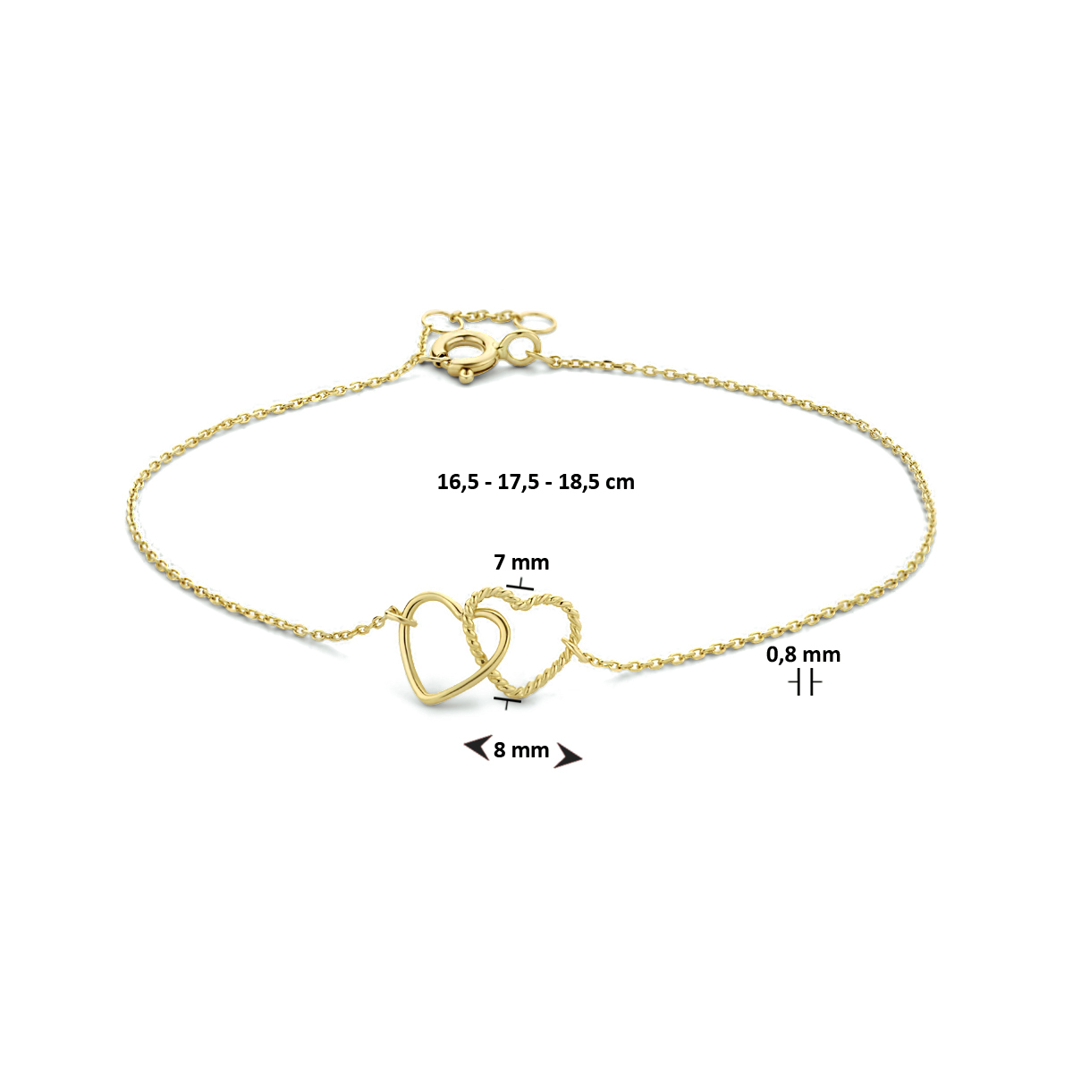 9k Geelkleurige armband uitgevoerd met twee hartjes. De armband heeft draaglengtes van 16.5, 17.5 en 18.5cm. De hartjes hebben een afmeting van 7x8mm. De schakelbreedte is 0.8mm.