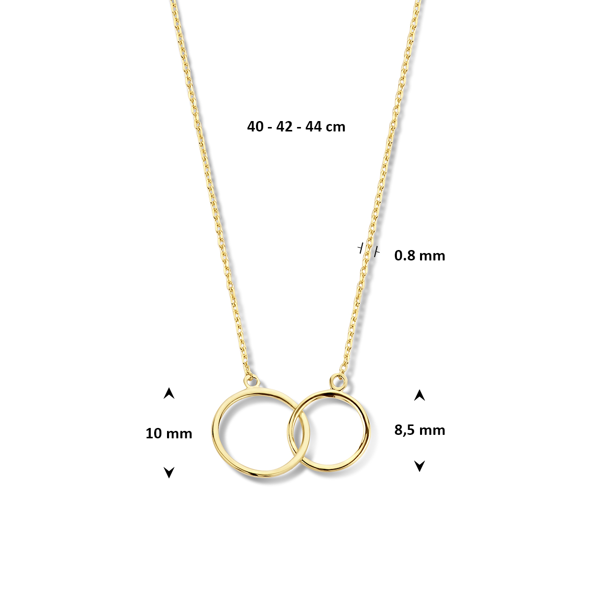 9k Geel kleurig collier uitgevoerd met 2 ringen. Het collier heeft draaglengtes van 40-42-44cm.