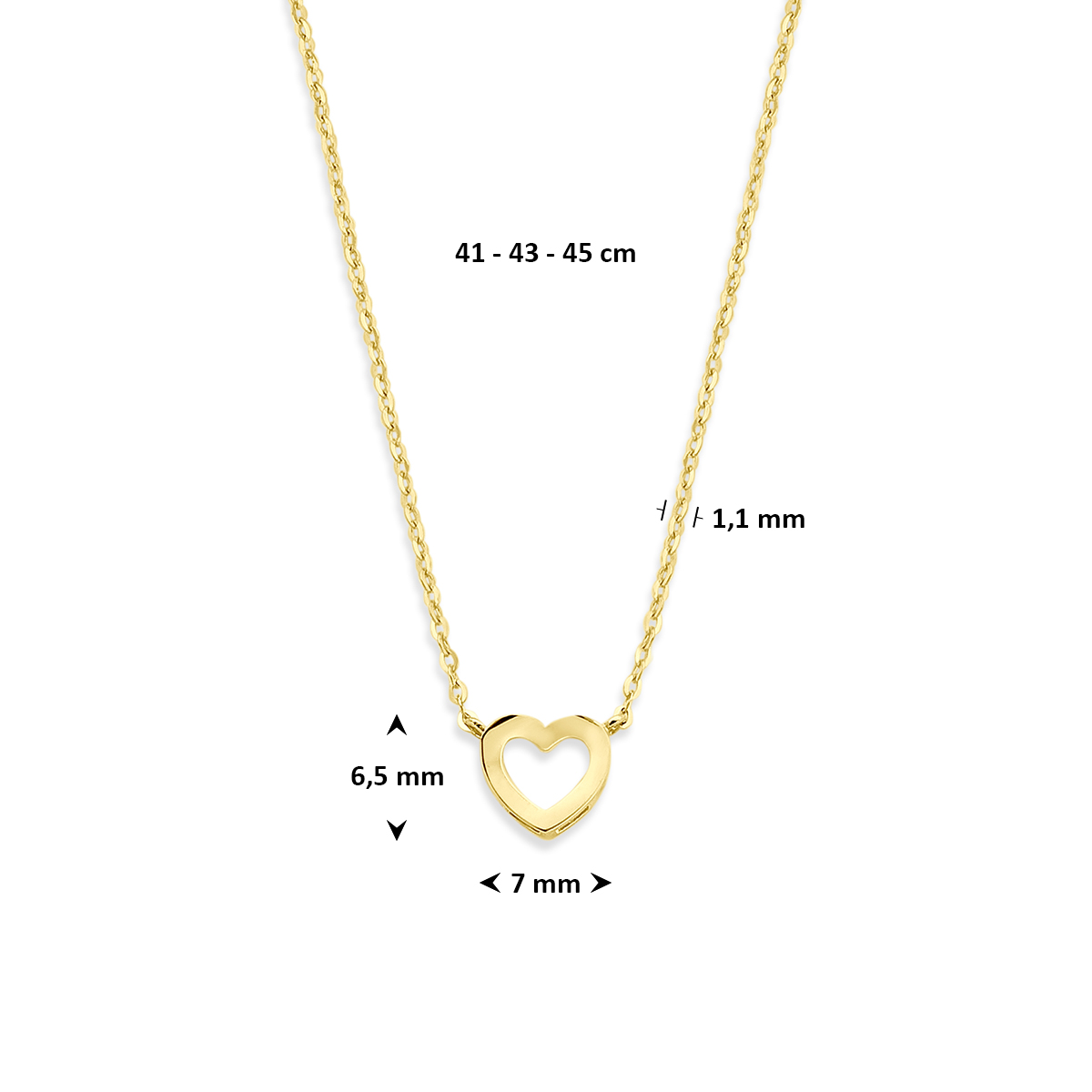 9k Geel kleurig collier uitgevoerd met een hartje. Het collier heeft draaglengtes van 41-43-45cm.