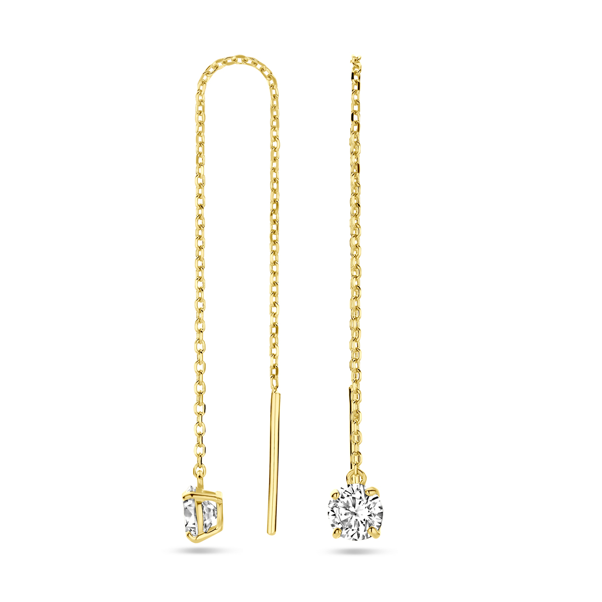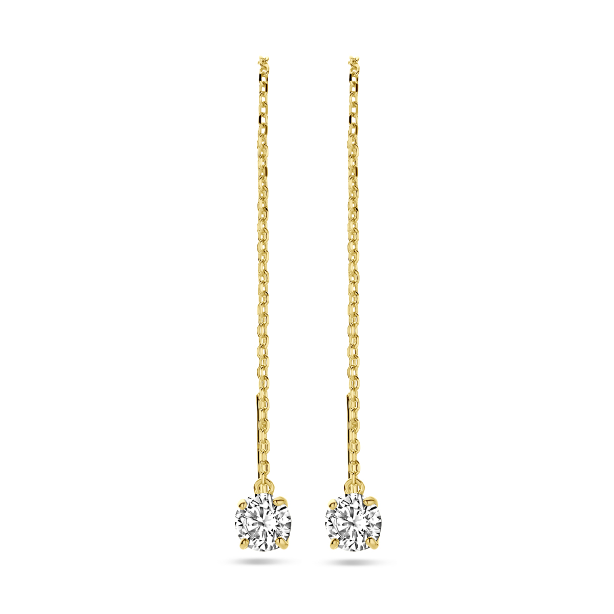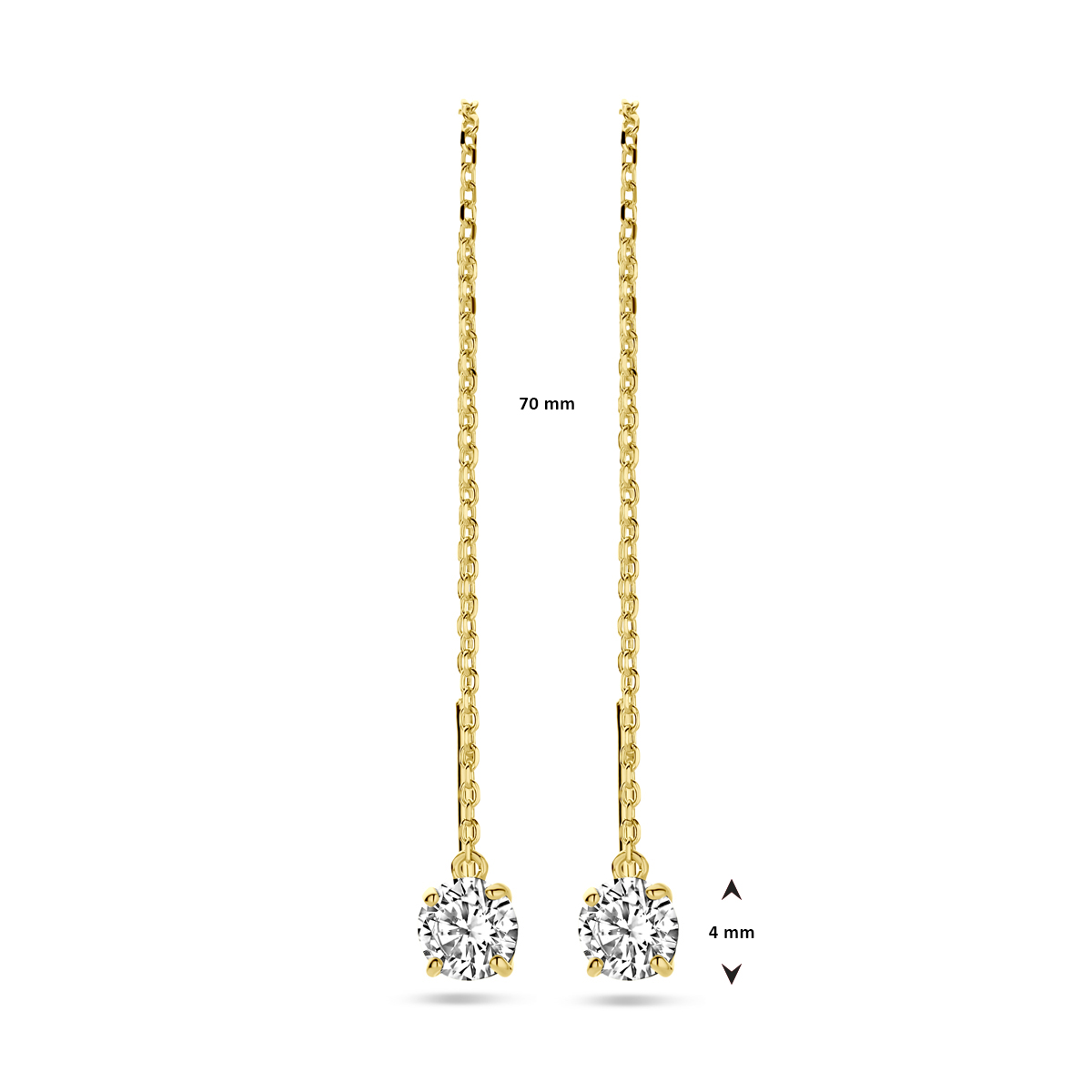 9k Geelkleurige doortrekoorbellen met een totale hoogte van 7cm uitgevoerd met een zirkonia van 4mm.