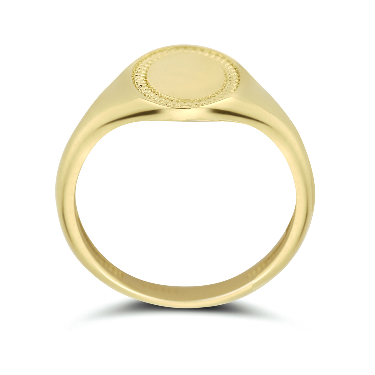 9k Geelkleurige graveerring. De ring heeft een breedte van 9.5 mm.