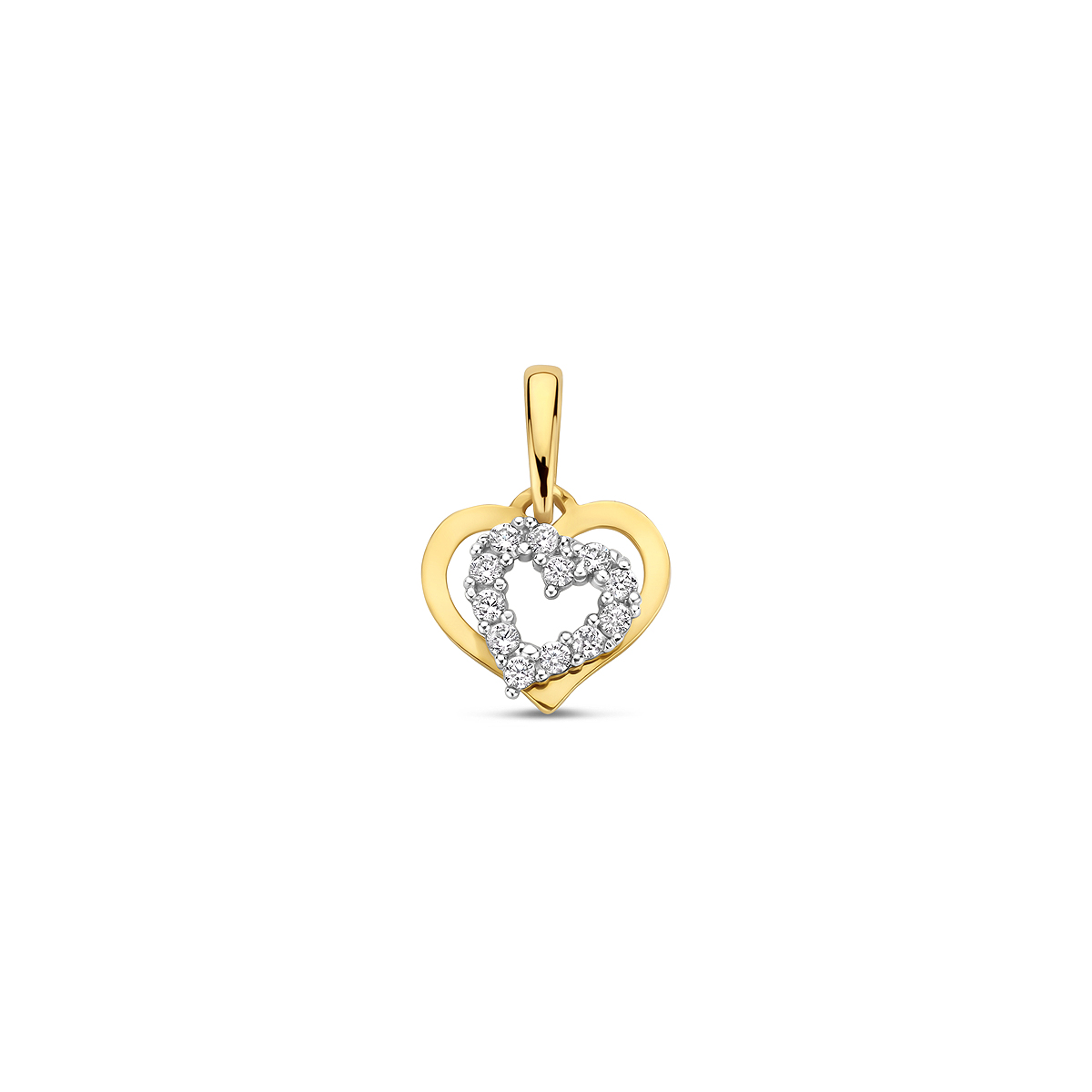 9k Bicolor wit- en geelkleurige hanger met een hart en zirkonia. Het hartje heeft een afmeting van 7x9mm.
