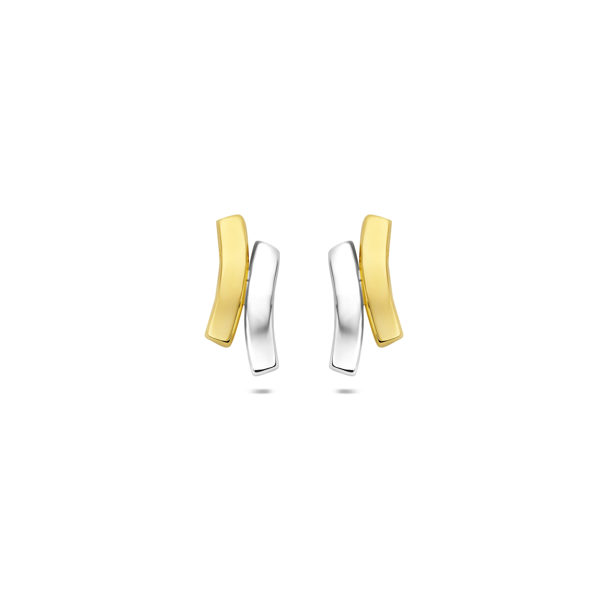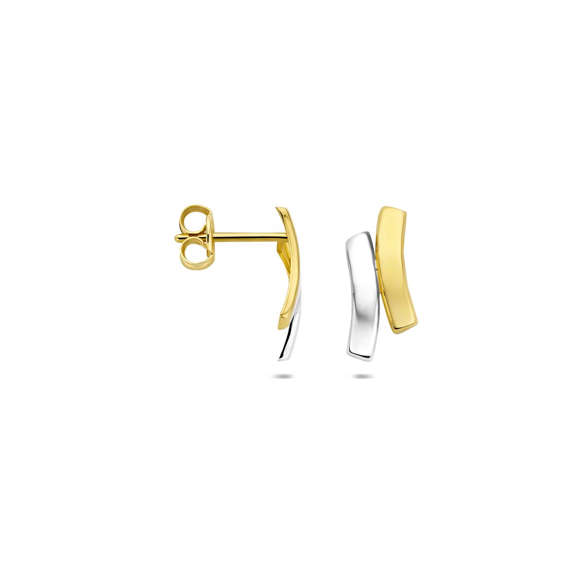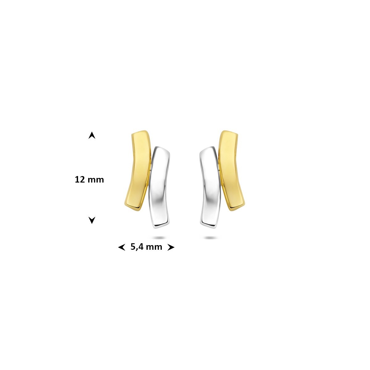 9k Bicolor wit- en geelkleurige oorknoppen met een poli afwerking. De oorknoppen hebben een afmeting van 12×5.4mm.