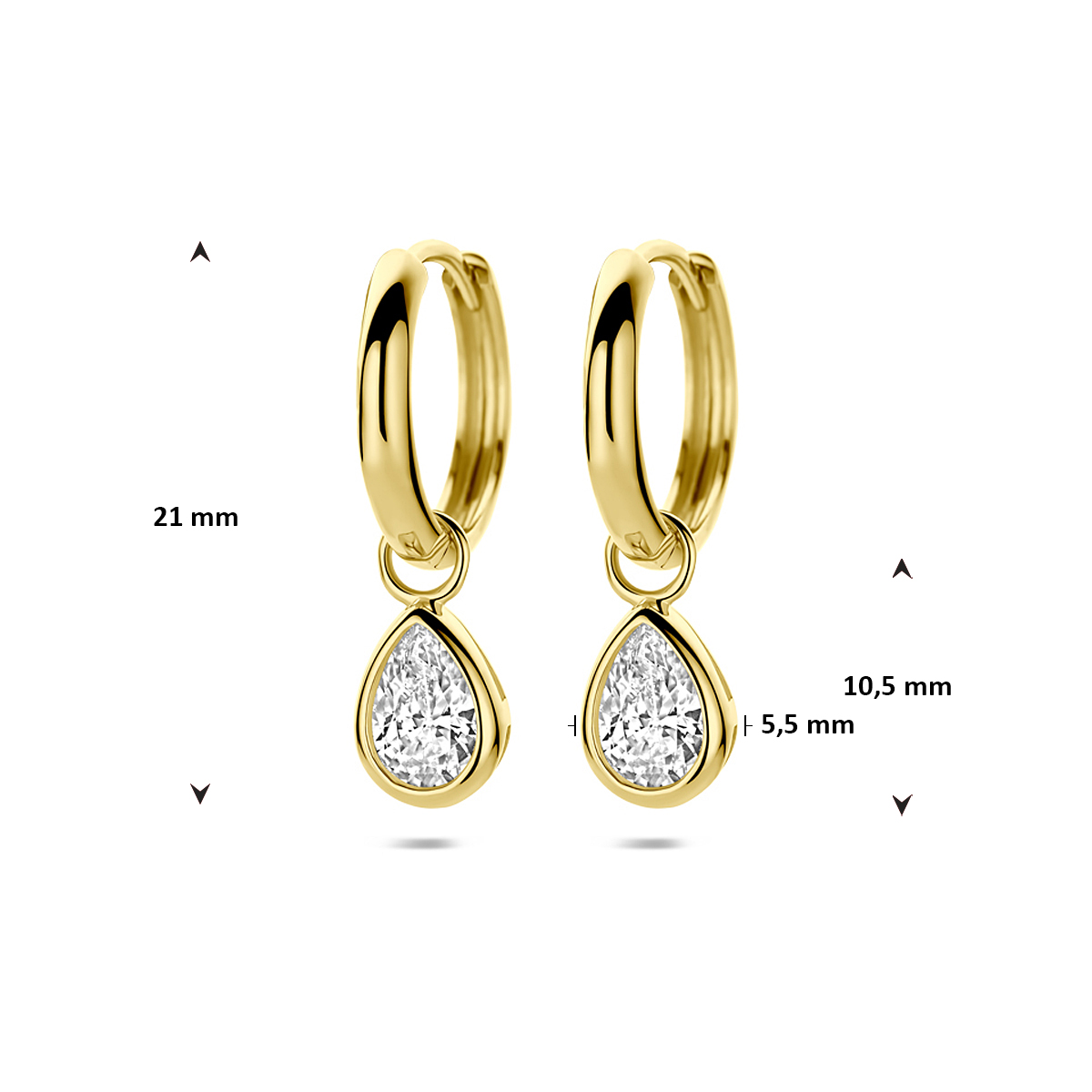 9k Geelkleurig oorringen met zirkonia. De oorringen hebben een totale hoogte van 21mm.