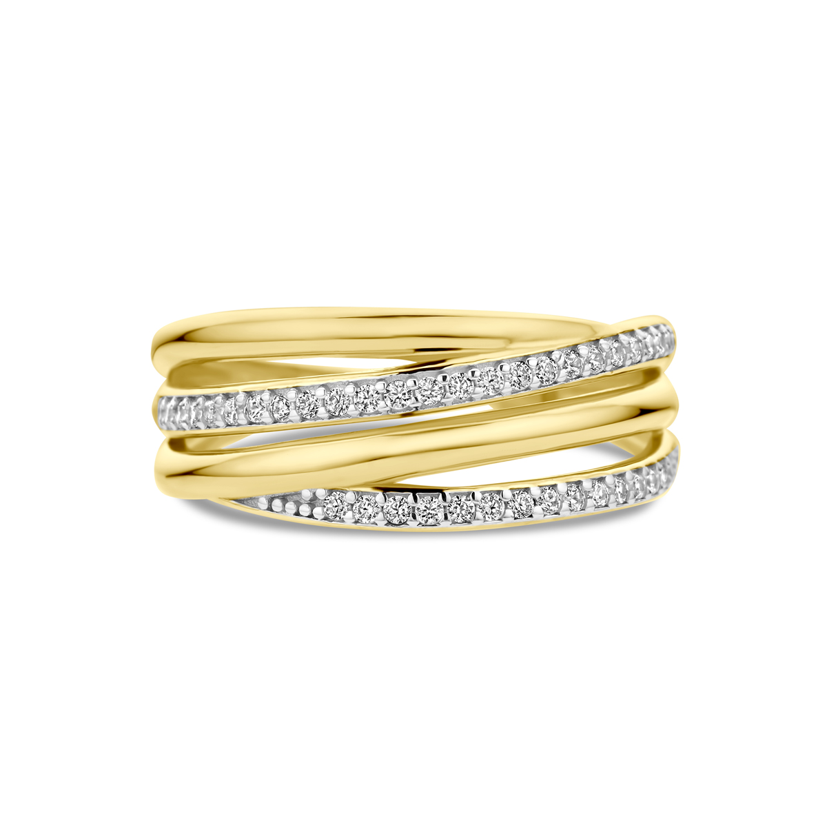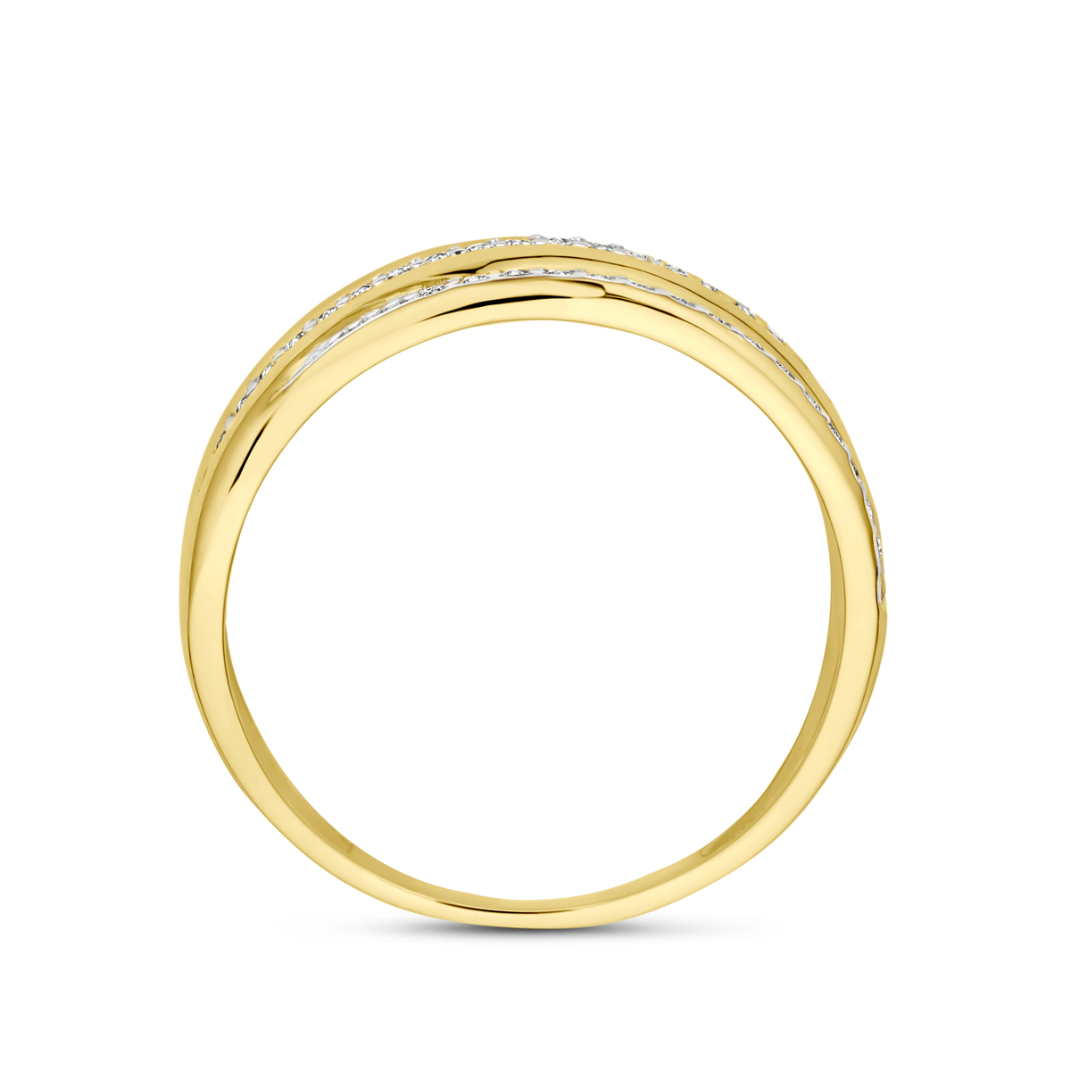 9k Geel kleurige ring uitgevoerd met zirkonia. De ring heeft een breedte van 8.5mm.