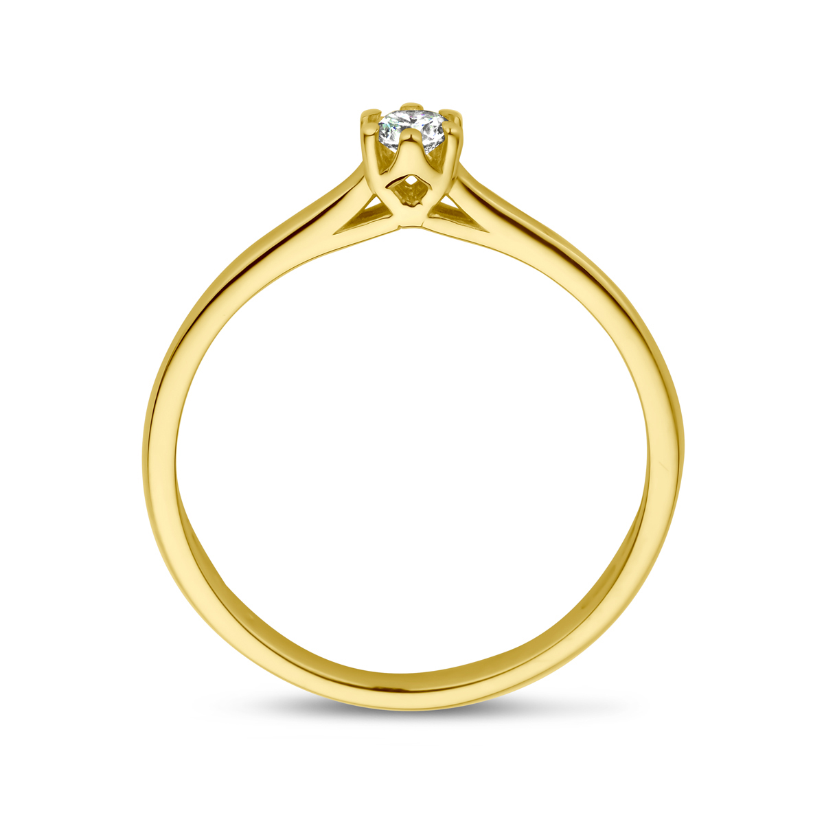 14k Geelgouden ring uitgevoerd met diamant. De ring heeft een breedte van 4mm.