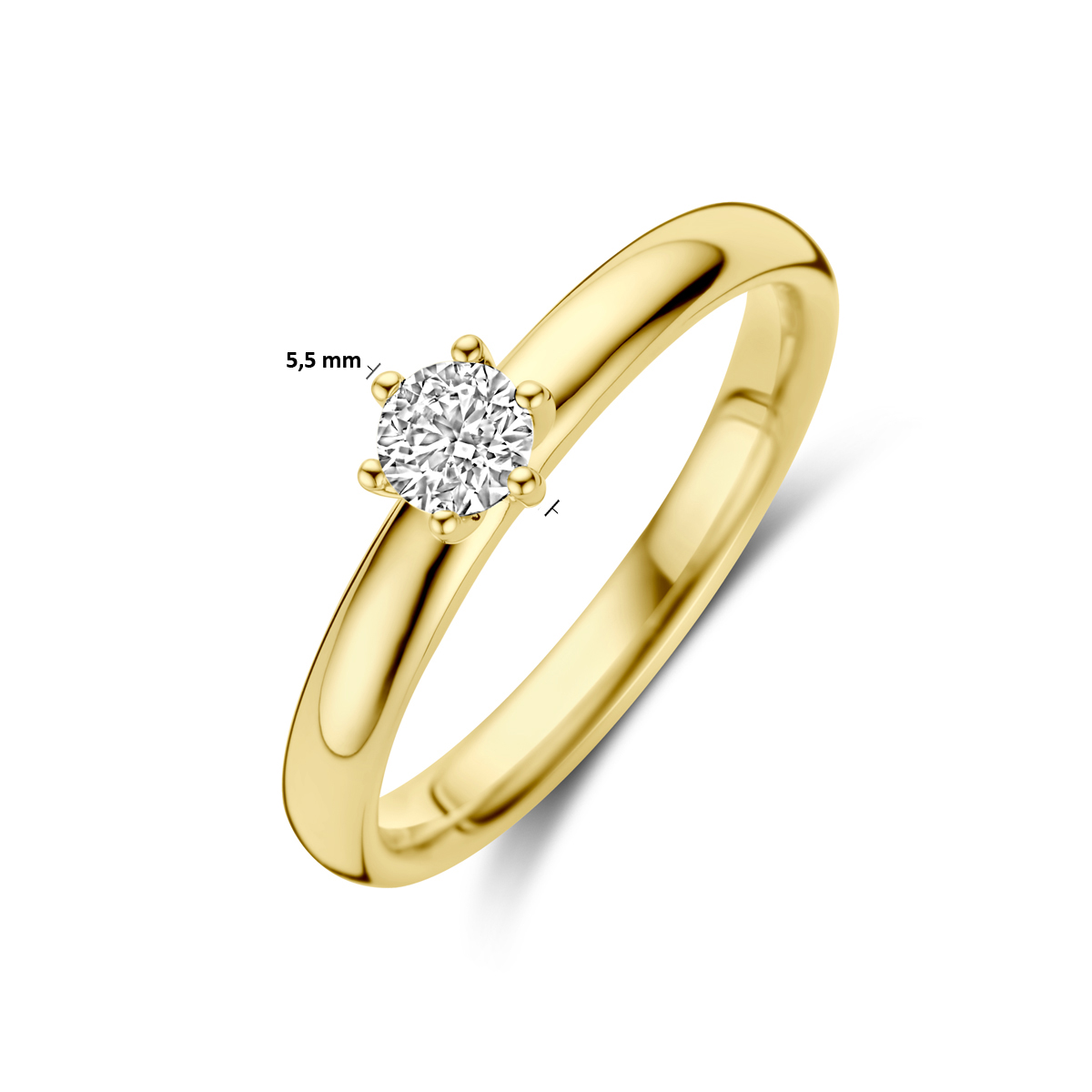 14k Geelgouden aanzoeksring uitgevoerd met diamant. De ring heeft een breedte van 5.5mm. De steenmaat is 4mm en het diamantgewicht is 0.25ct.