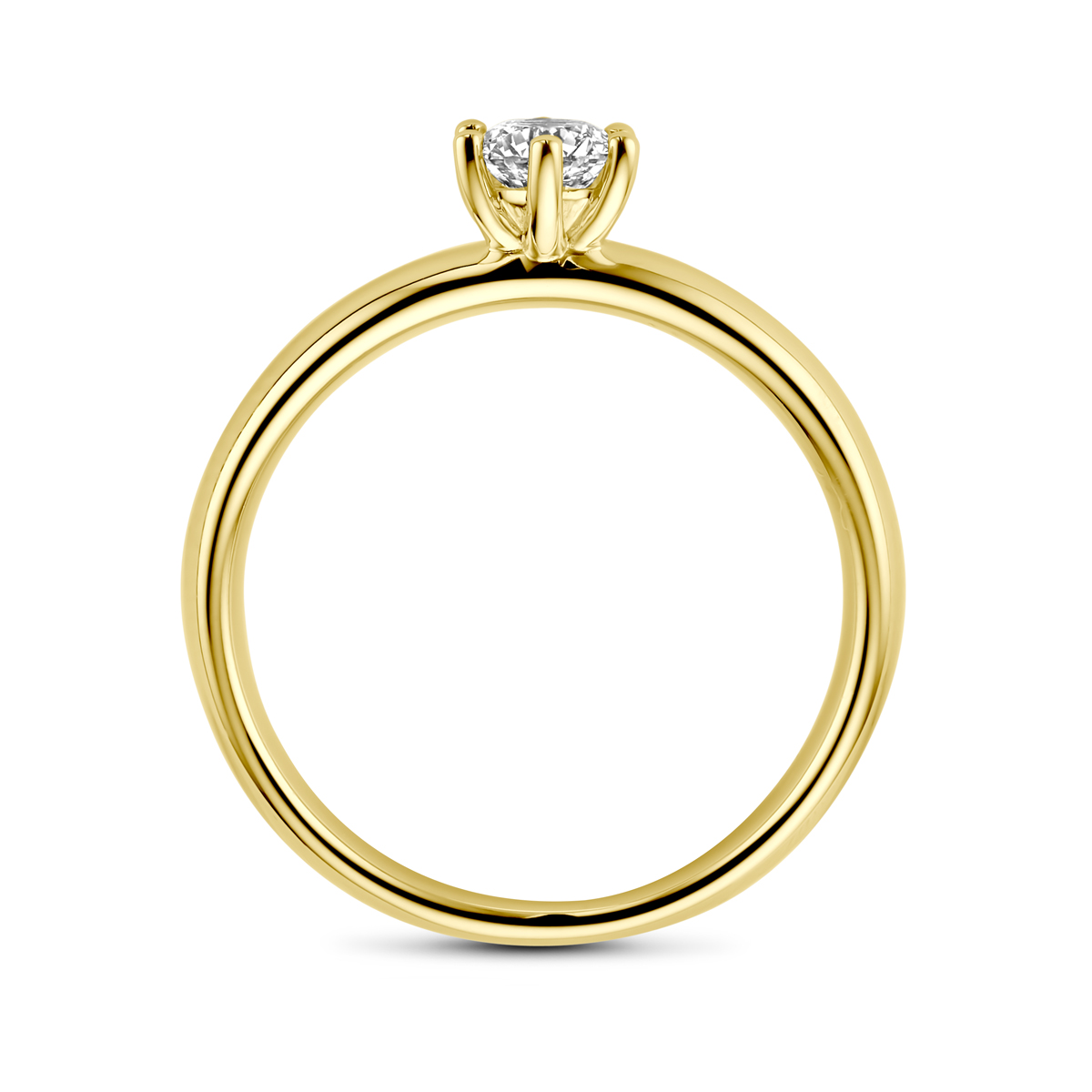 14k Geelgouden aanzoeksring uitgevoerd met diamant. De ring heeft een breedte van 5.5mm. De steenmaat is 4.5mm en het diamantgewicht is 0.33ct.
