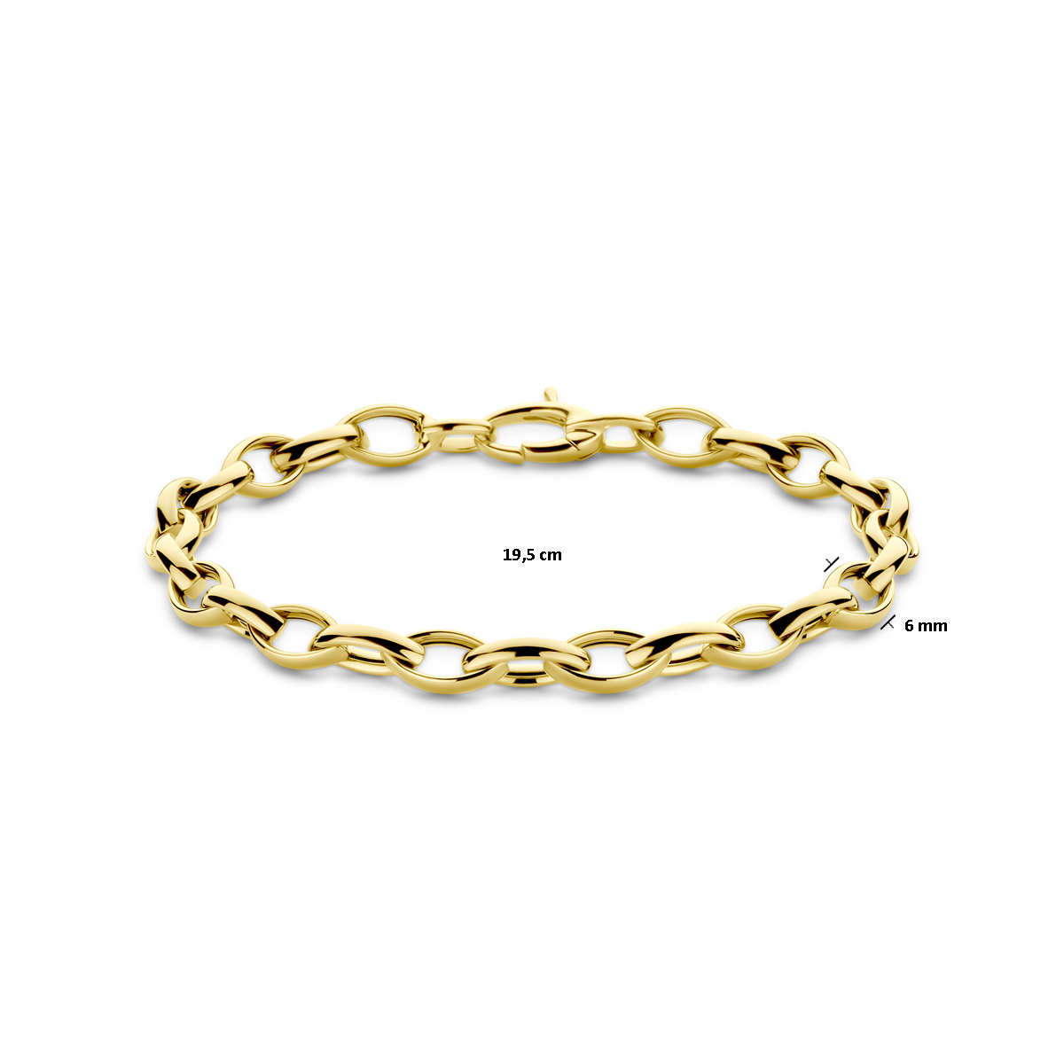 14k Geelgouden armband met een schakelbreedte van 6mm en een draaglengte van 19.5cm. Uitgevoerd met karabijnsluiting.
