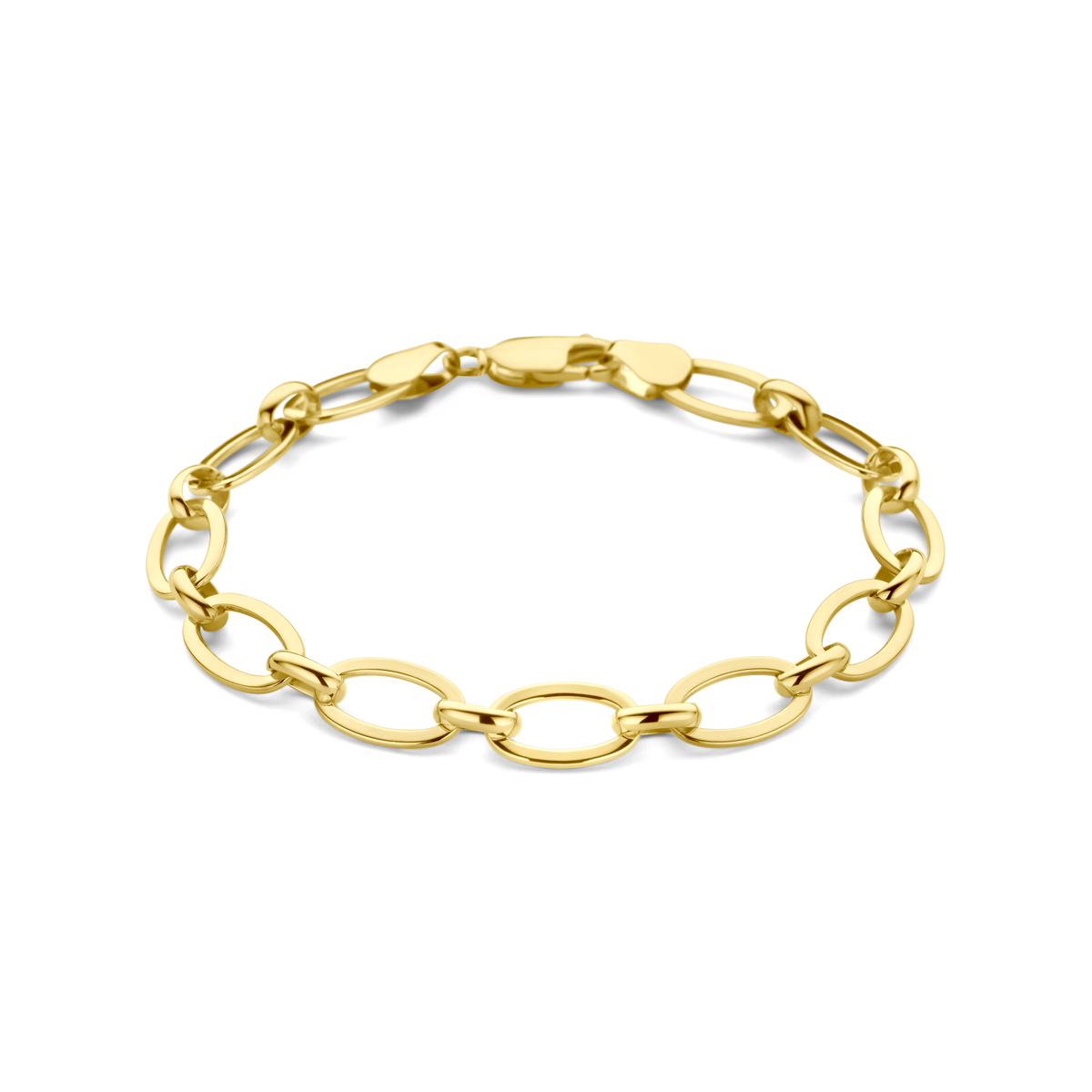 14k Geelgouden armband met een kern van 925 zilver. De armband heeft een schakelbreedte van 8.5mm en een draaglengte van 19cm. De armband is uitgevoerd met een stevige karabijn sluiting.