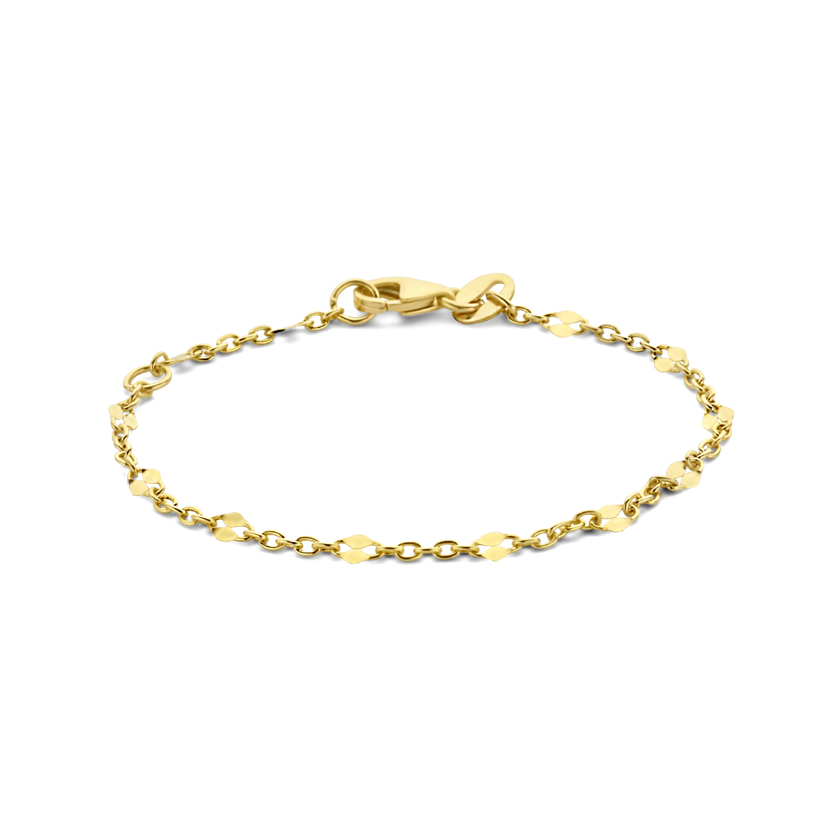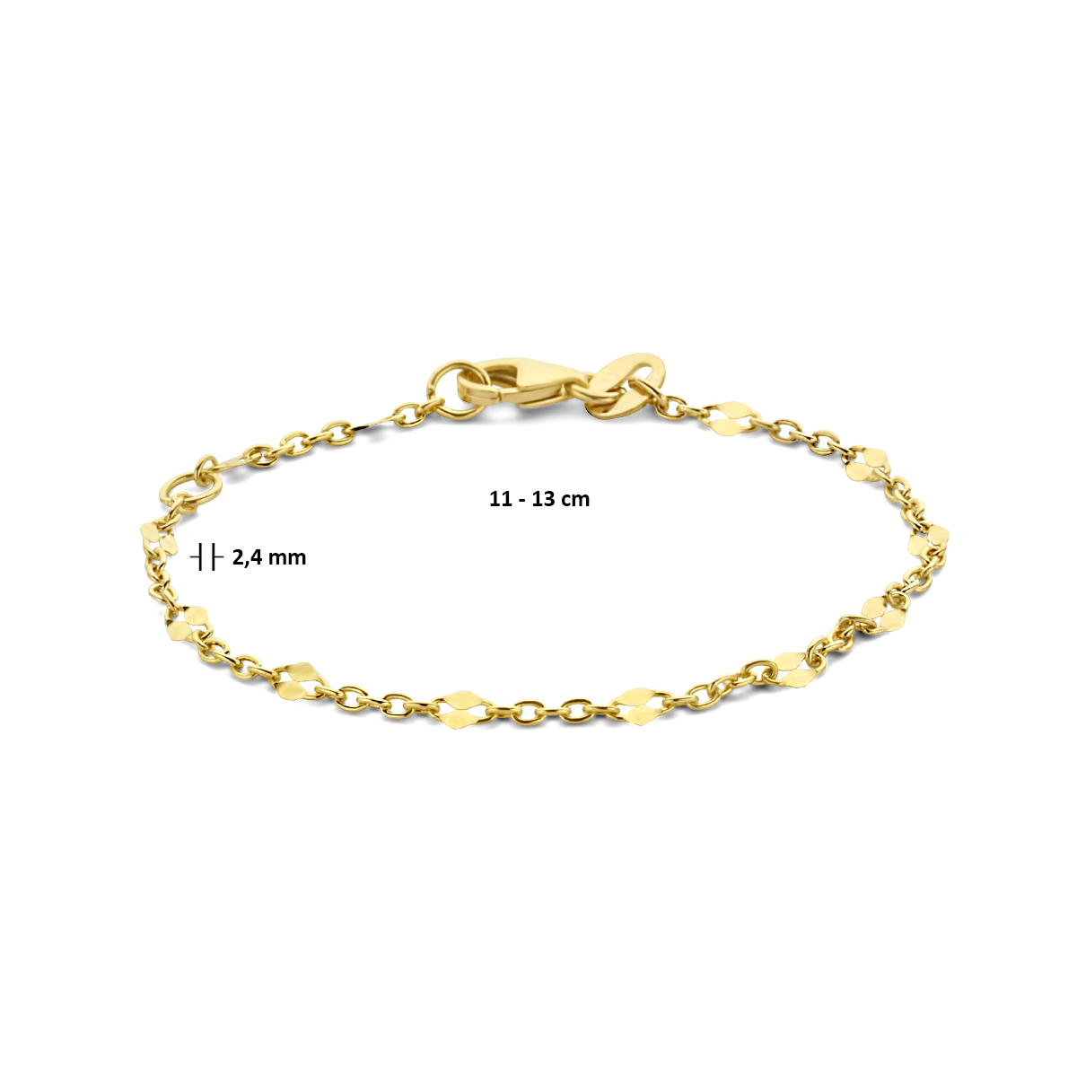 14k Geelgouden armband met een schakelbreedte van 2.4mm en een karabijn sluiting. De armband heeft draaglengtes van 11 en 13cm.