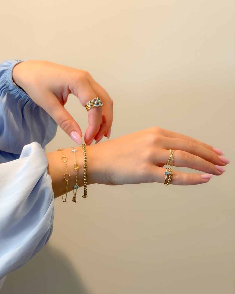 Soepele geelgouden armband met gouden bolletjes. Leuk om zo te dragen, maar ook perfect te combineren met andere armbanden voor een speelse look.