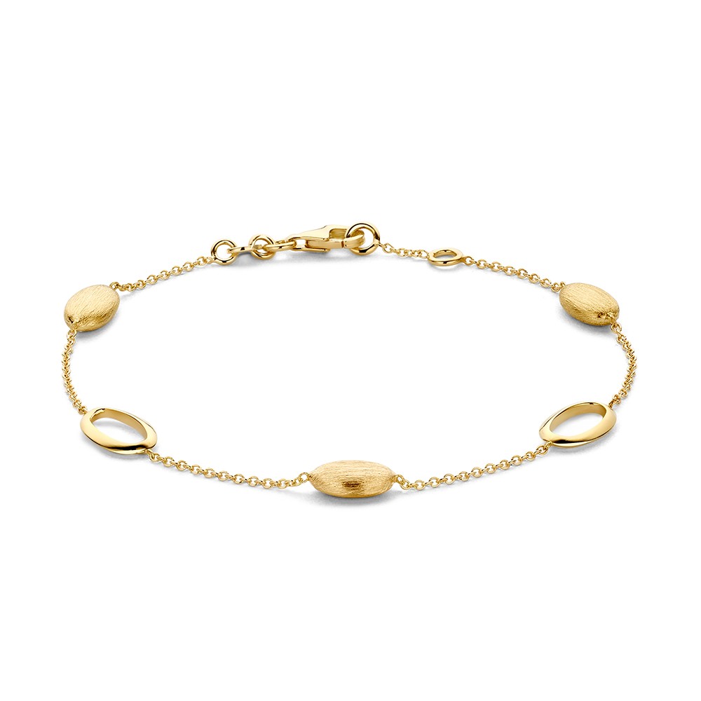 Stijlvolle geelgouden armband met speelse elementen in gematteerde en gepolijste afwerking.