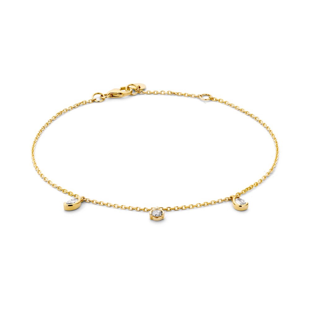 Verfijnde en speelse armand met drie diamanten in open bezel zetting, de diamanten hebben ieder een eigen slijpvorm: briljant, markies en peer.