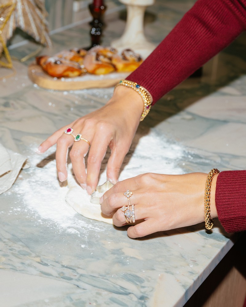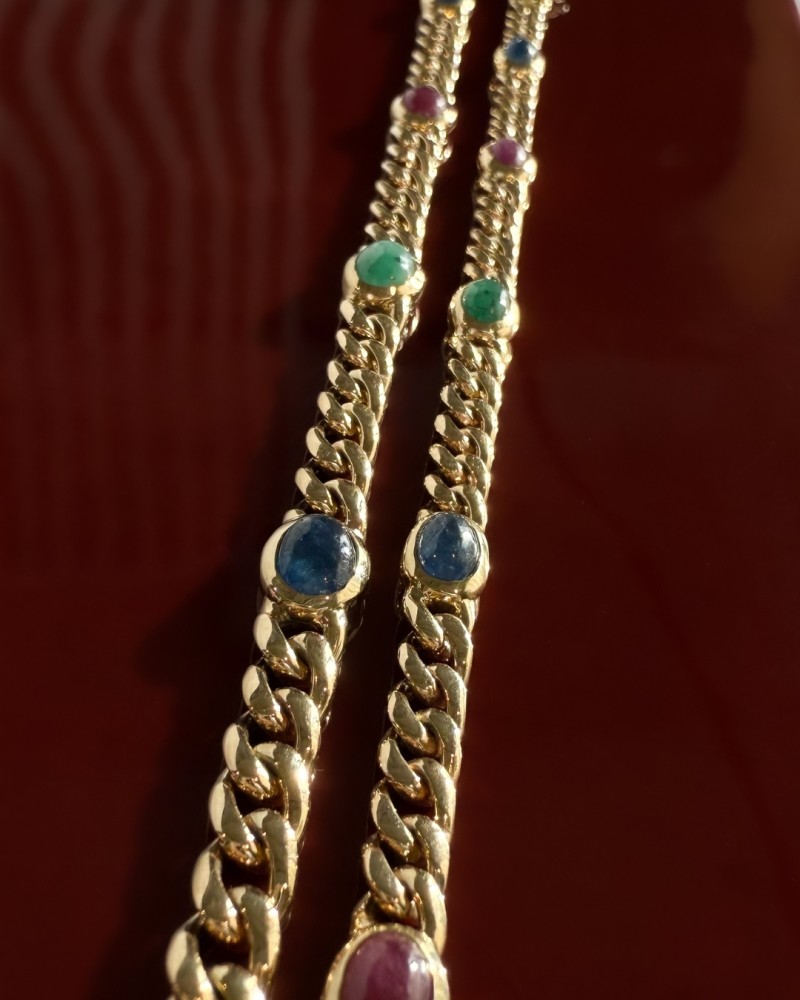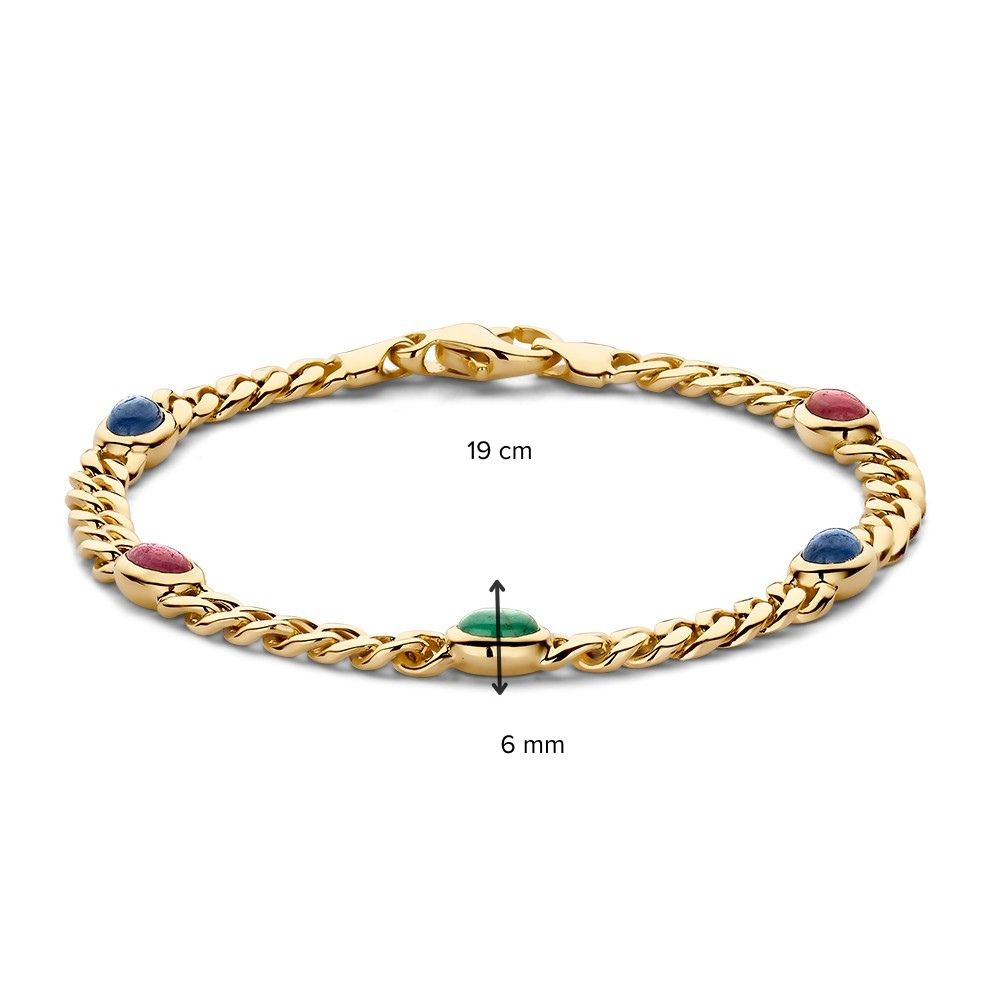 Stijlvolle, geelgouden armband met klassieke gourmetschakel en vijf cabuchon geslepen edelstenen (saffier, robijn, smaragd).