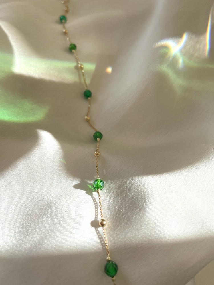 Geelgouden armband met donkergroene zirkonia bolletjes.