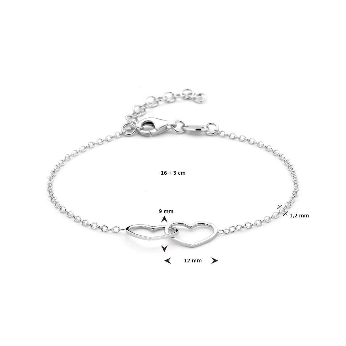Gerhodineerd zilveren 1.2mm anker armband met een lengte van 16cm en een extensie van 3cm uitgevoerd met 2 harten van 9x12mm. Het collier is te combineren met bijpassende sieraden uit onze collectie.
