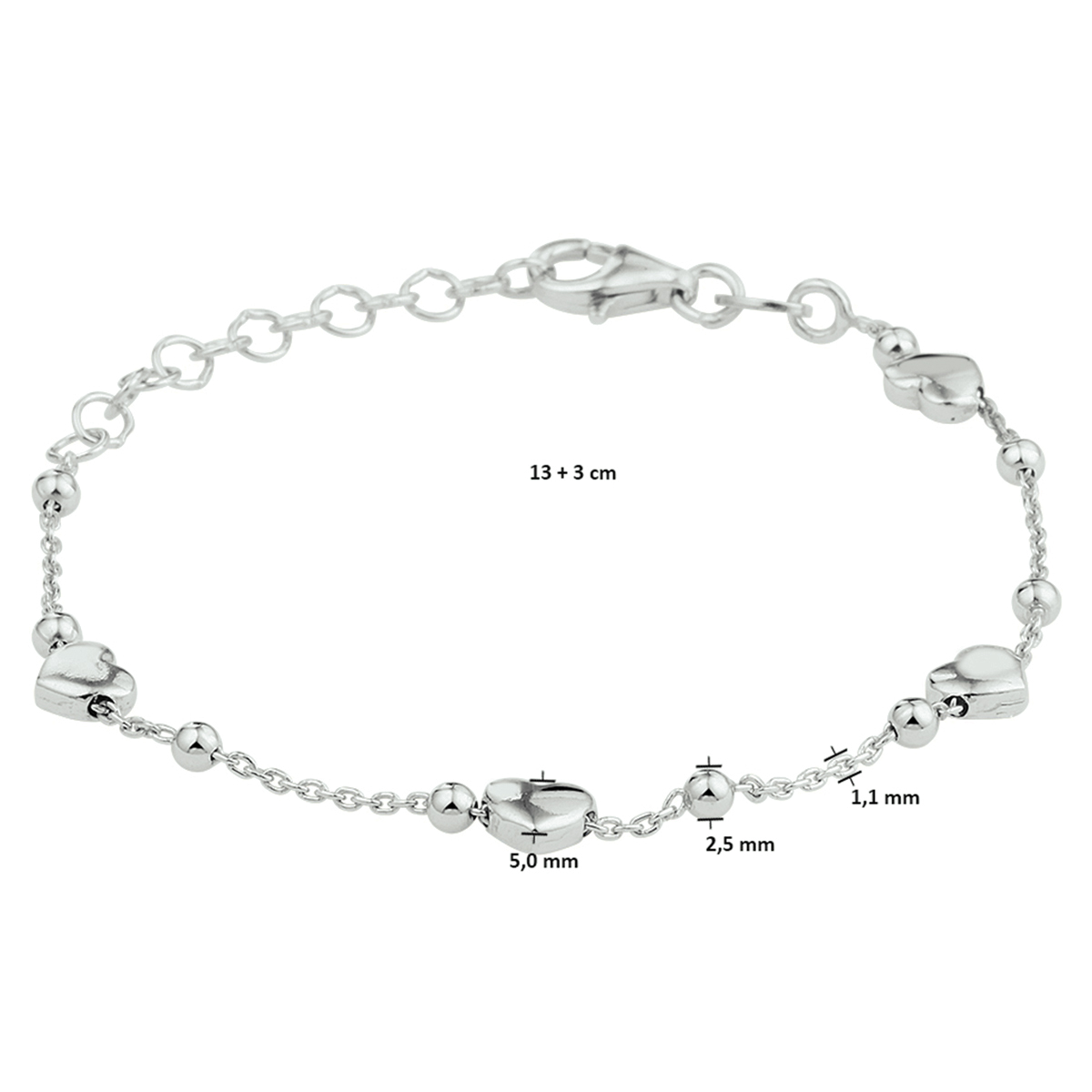 Gerhodineerd 925 zilveren armband uitgevoerd met bolletjes en schattige hartjes. De armband heeft een draaglengte van 13cm met een extensie van 3cm en een stevige karabijn sluiting. De hartjes hebben een afmeting van 5×5.5mm. De schakelbreedte is 2.5mm.