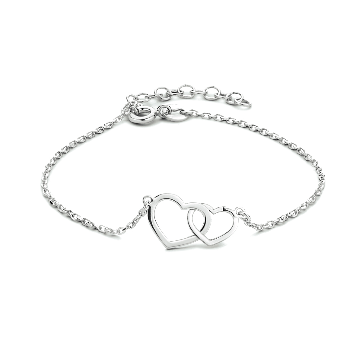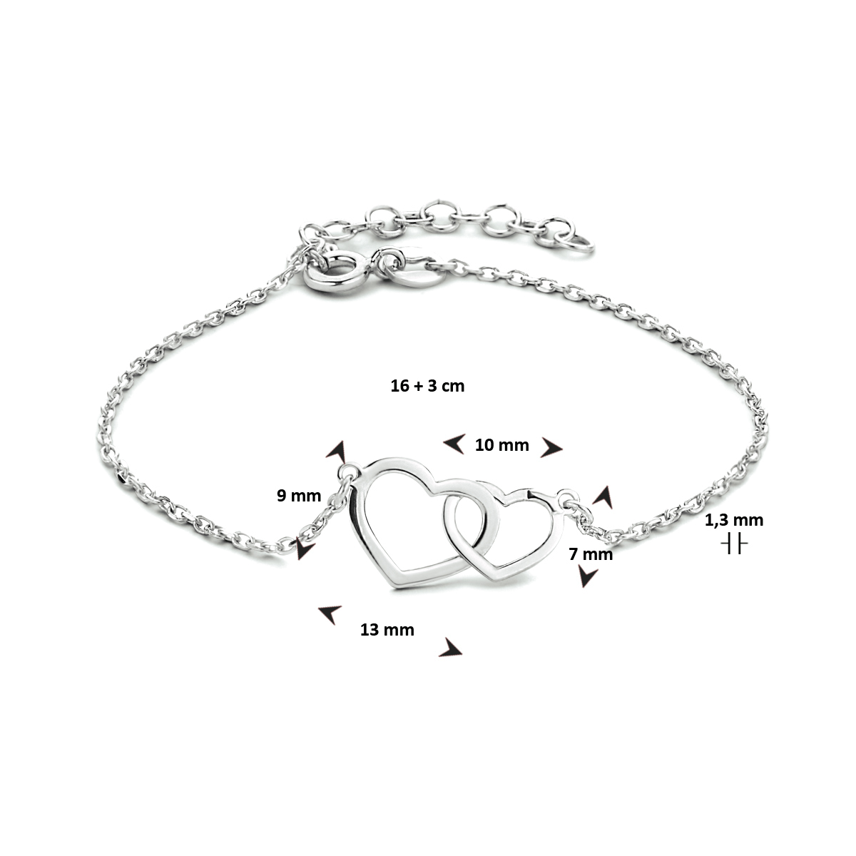 Gerhodineerd 925 zilveren armband uitgevoerd met twee hartjes. De armband heeft een draaglengte van 16cm met een extensie van 3cm. De hartjes hebben een afmeting van 7x10mm en 9x13mm. De schakelbreedte is 1.3mm.