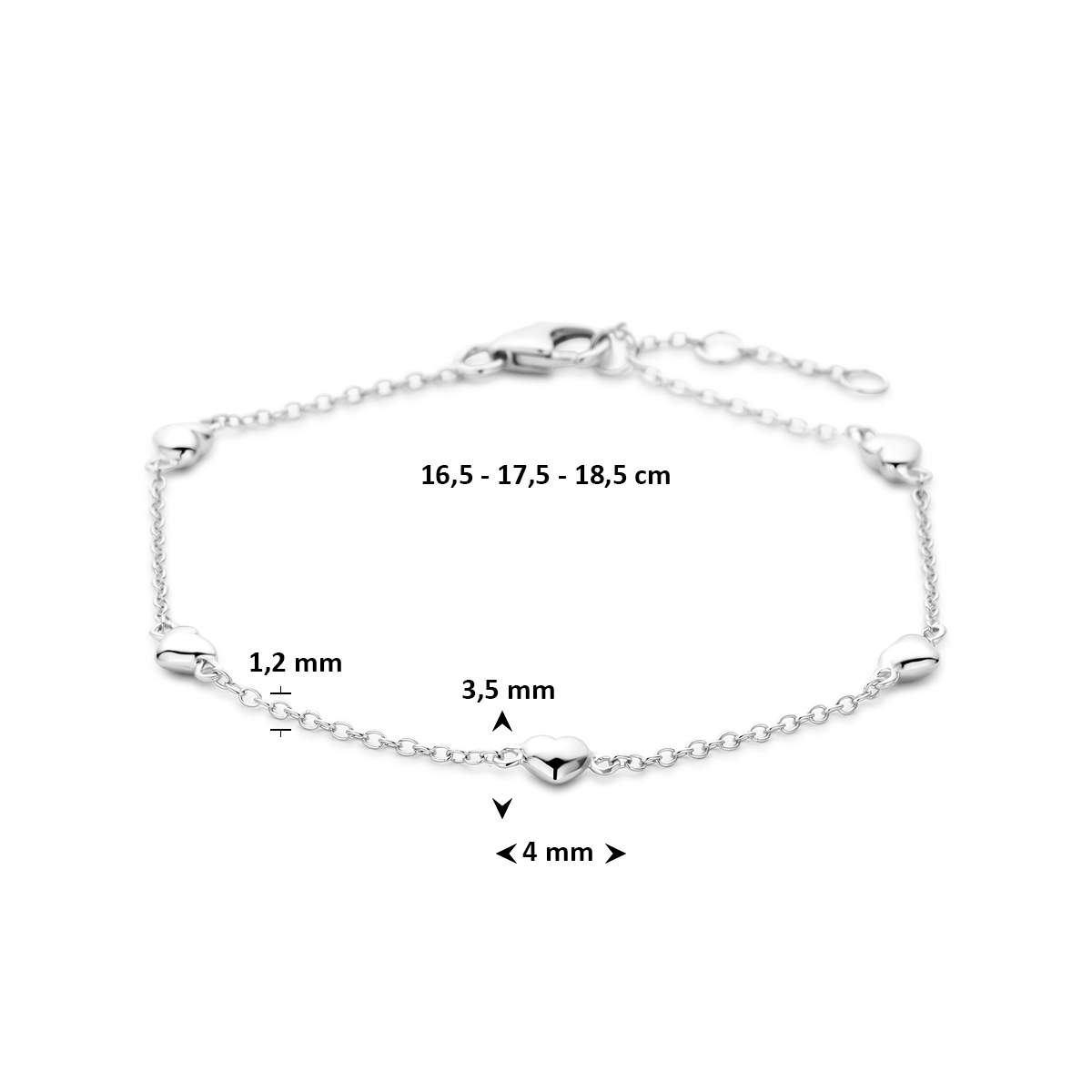 Gerhodineerd 925 zilveren armband met hartjes. De armband heeft draaglengtes van 16.5-17.5-18.5cm en een schakelbreedte van 1.2mm. Uitgevoerd met een karabijnsluiting.