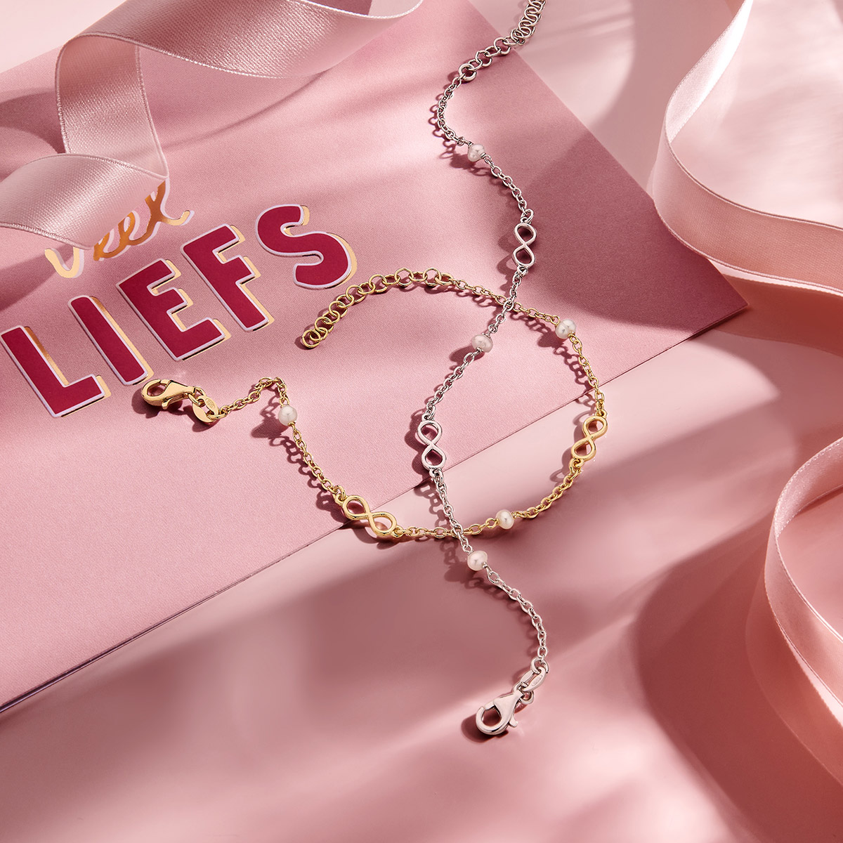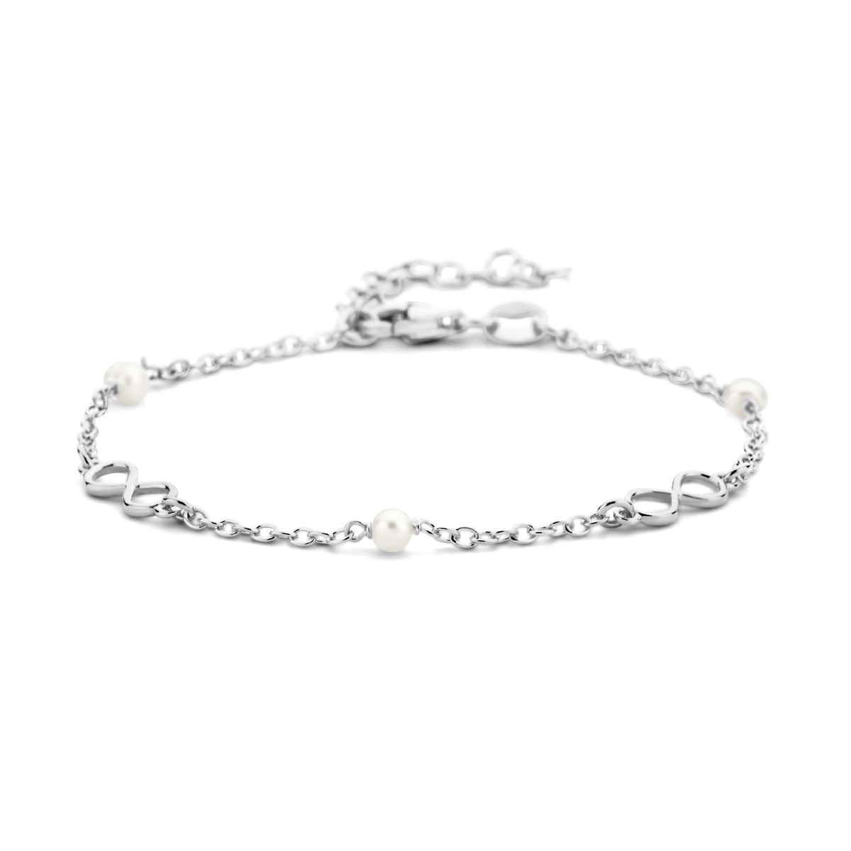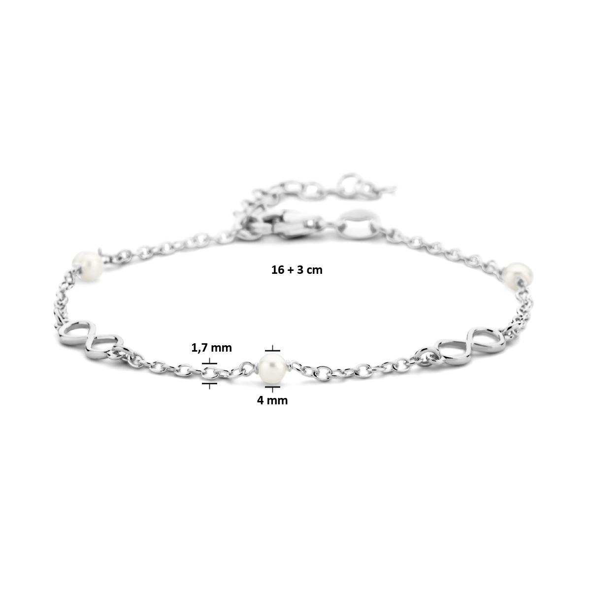 Gerhodineerd 925 zilveren armband uitgevoerd met zoetwaterparels en een infinity hanger. De armband heeft een draaglengte van 16cm en een extesie van 3cm. De schakelbreedte is 1.7mm. Uitgevoerd met een karabijn sluiting.