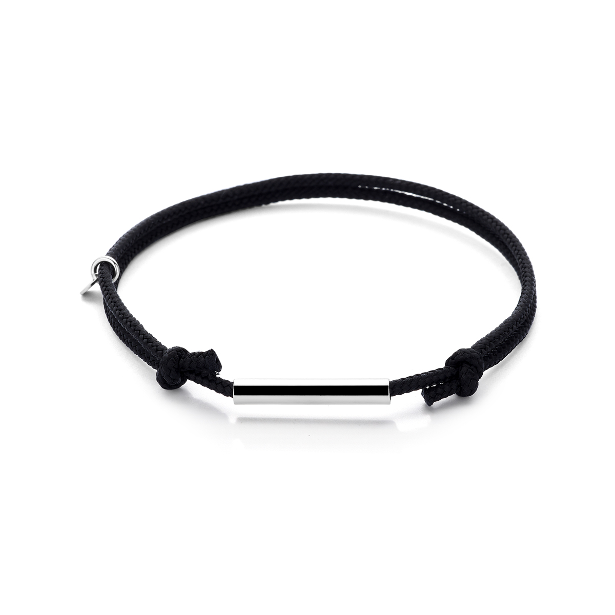 Zwart katoen armband uitgevoerd met een gerhodineerd staafje. De armband heeft een lengte van 16-32cm. Het staafje heeft een afmeting van 3.5x21mm.