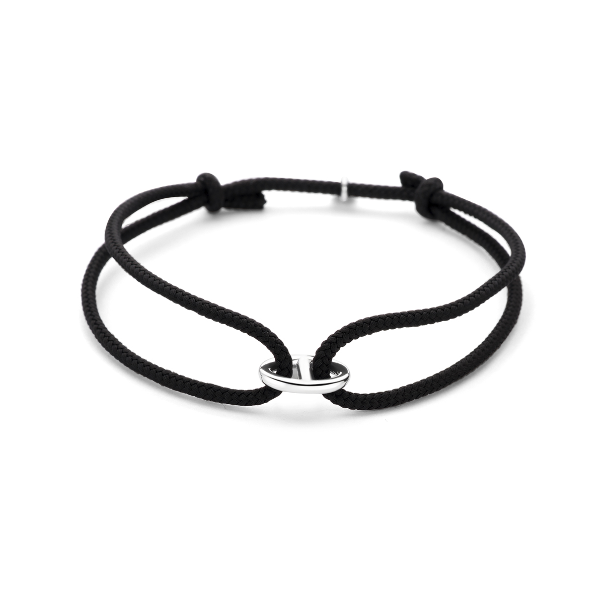 Zwart katoen armband uitgevoerd met een gerhodineerde koffieboon schakel. De armband heeft een lengte van 16-32cm. De schakel heeft een afmeting van 8×12.5mm.