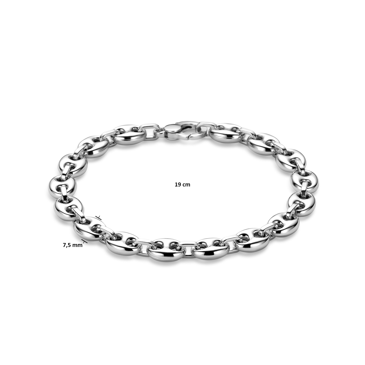 Gerhodineerd 925 zilveren armband uitgevoerd met een koffieboon schakel van 7.5mm. De armband heeft een draaglengte van 19cm en is uitgevoerd met karabijnsluiting.