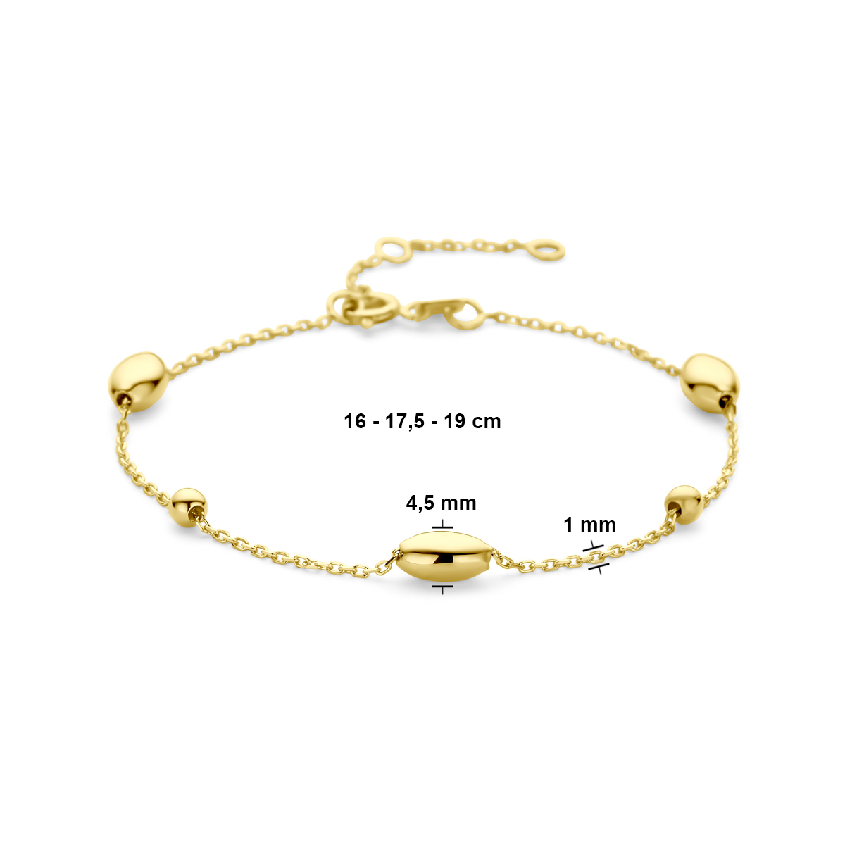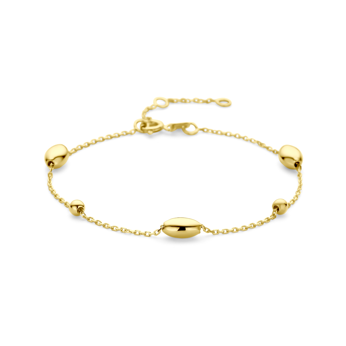 14k Geelgouden armband uitgevoerd met ovaaltjes en bolletjes. De armband heeft draaglengtes van 16, 17.5 en 19cm.