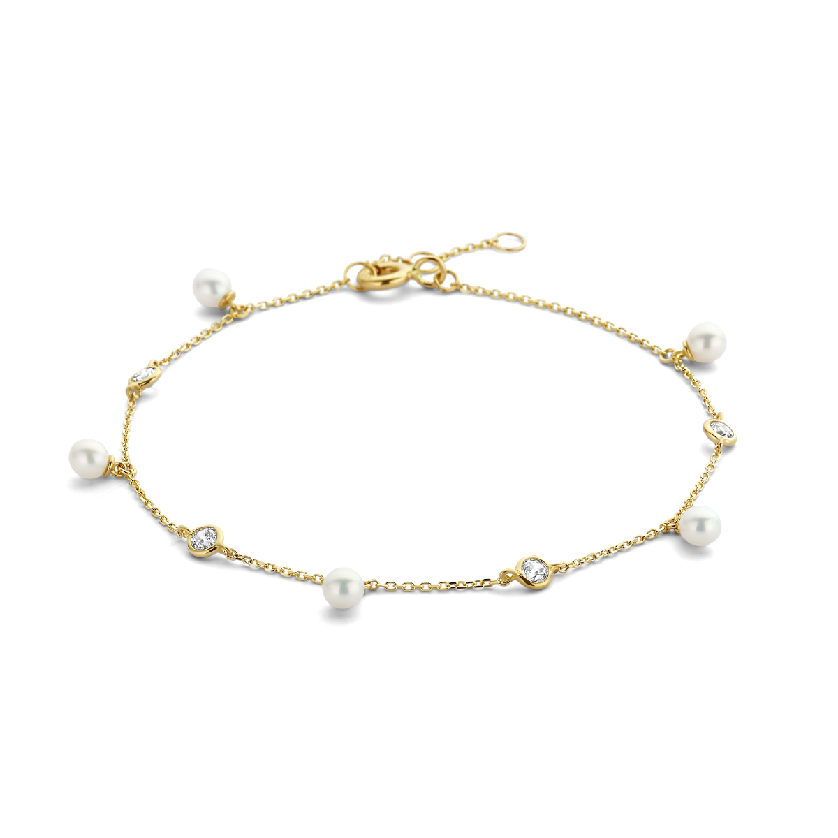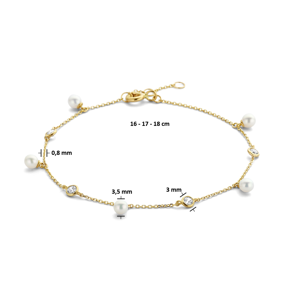 14k Geelgouden armband uitgevoerd met zoetwaterparels en zirkonia. De armband heeft draaglengte van 16, 17 en 18cm. De schakelbreedte is 0.8mm.