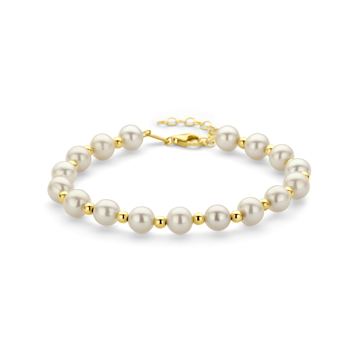 14k Geelgouden armband uitgevoerd met parels. De armband heeft een draaglengte van 17cm met 3cm extensie. Uitgevoerd met karabijnsluiting.
