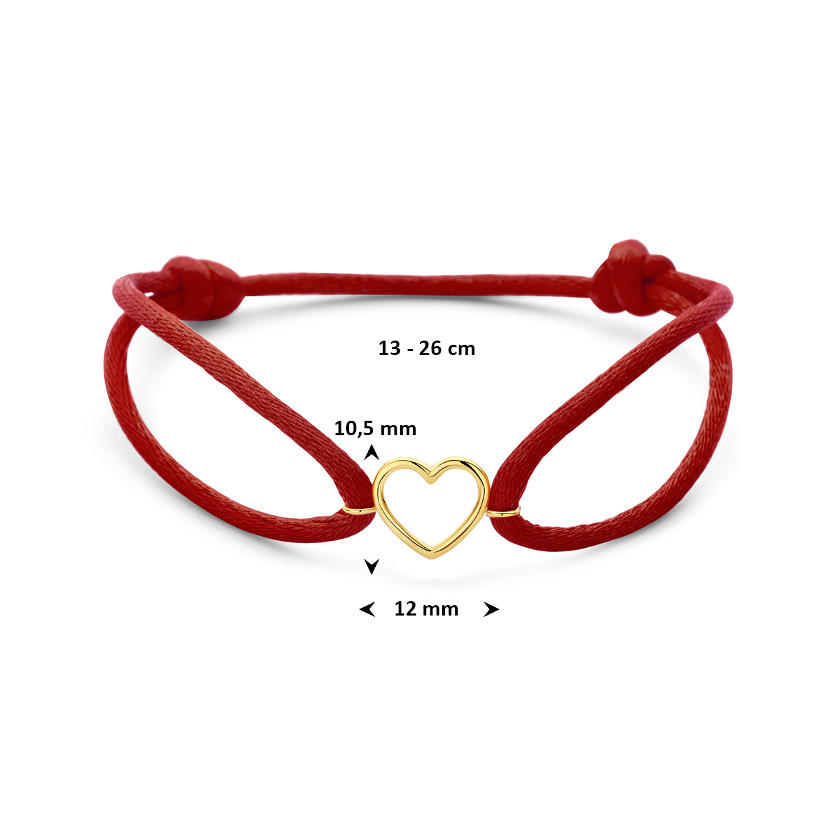 Rood satijn armband uitgevoerd met een 14k geelgouden hartje met een afmeting van 10.5x12mm. De armband heeft draaglengtes van 13 tot 26cm.