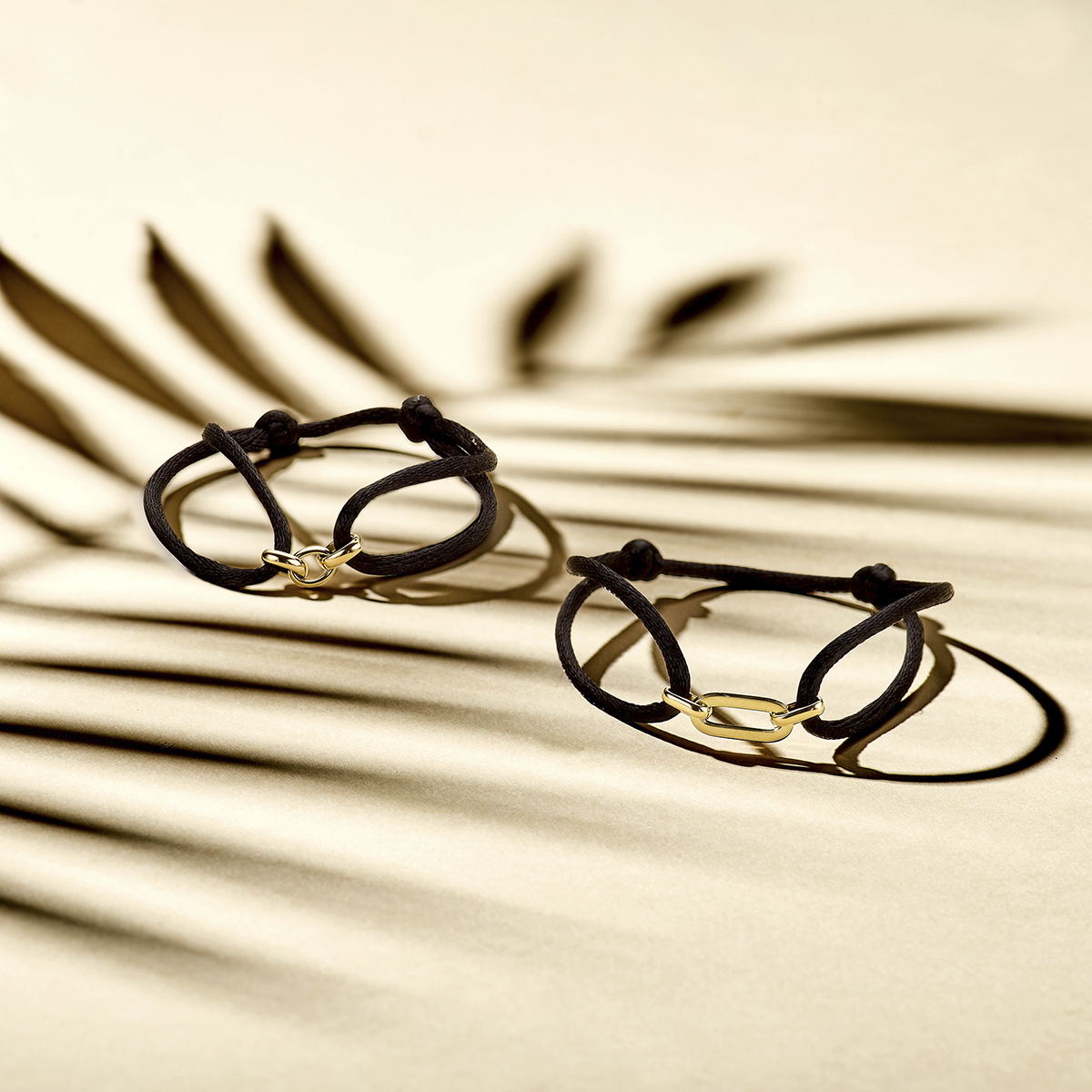 Zwart gevlochten armband uitgevoerd met 14k geelgouden schakels. De armband heeft draaglengtes van 13 tot 26cm. De schakels hebben een breedte van 5mm.