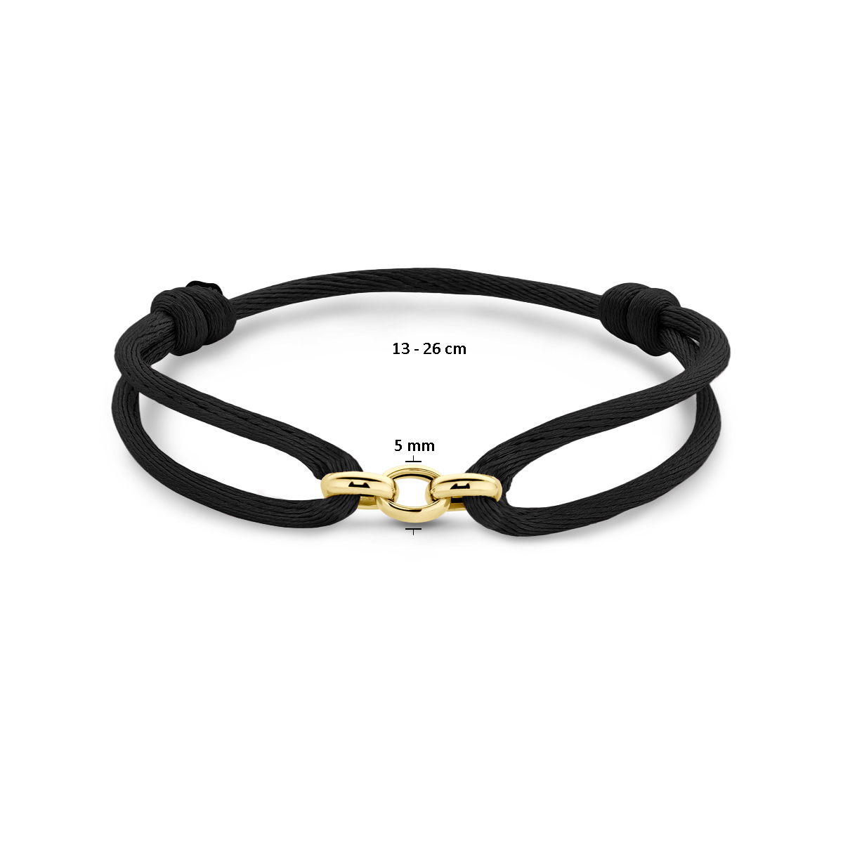 Zwart gevlochten armband uitgevoerd met 14k geelgouden schakels. De armband heeft draaglengtes van 13 tot 26cm. De schakels hebben een breedte van 5mm.