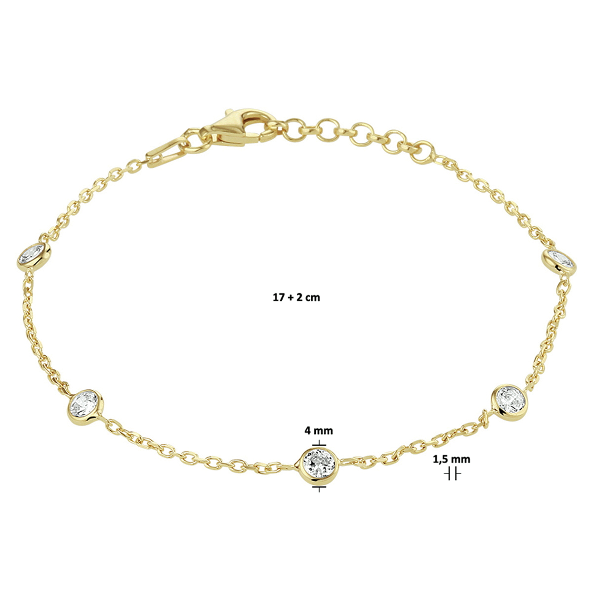 Verguld op 925 zilveren armband uitgevoerd met een schitterende zirkonia en een stevige karabijn sluiting. De armband heeft een draaglengte van 17cm met een extensie van 2cm. De schakelbreedte is 1.5mm. Geen garantie op plating.