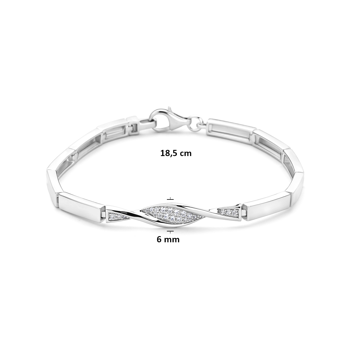 Gerhodineerd 925 zilveren armband met zirkonia. De armband heeft een schakelbreedte van 6mm en een draaglengte van 18.5cm. Uitgevoerd met een karabijnsluiting.