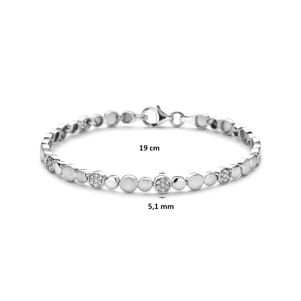 Gerhodineerd 925 zilveren armband met zirkonia. De armband heeft een schakelbreedte van 5,1mm en een draaglengte van 19 cm. Uitgevoerd met een karabijnsluiting.