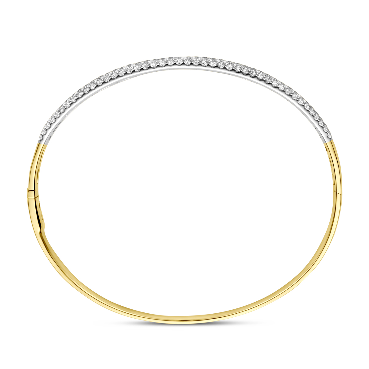 14k Bicolor geel en witgouden bangle uitgevoerd met diamanten. De bangle heeft een afmeting van 4.5x60mm. Het totale diamantgewicht is 1.93ct.