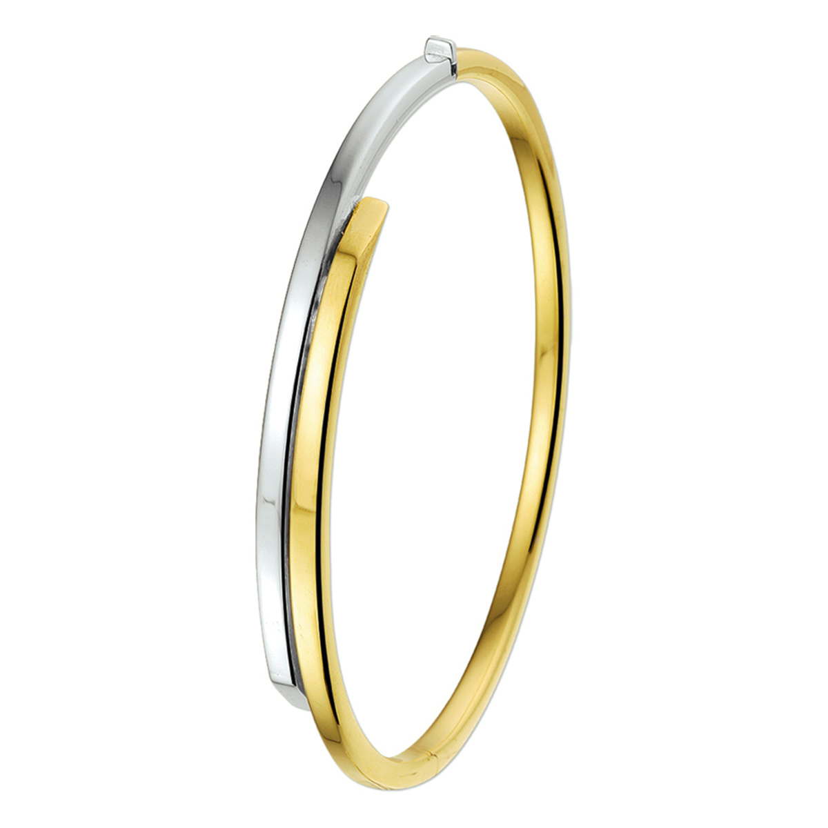 Bicolor wit- en geellgouden bangle met een vlakke buis en een scharnier-sluiting.