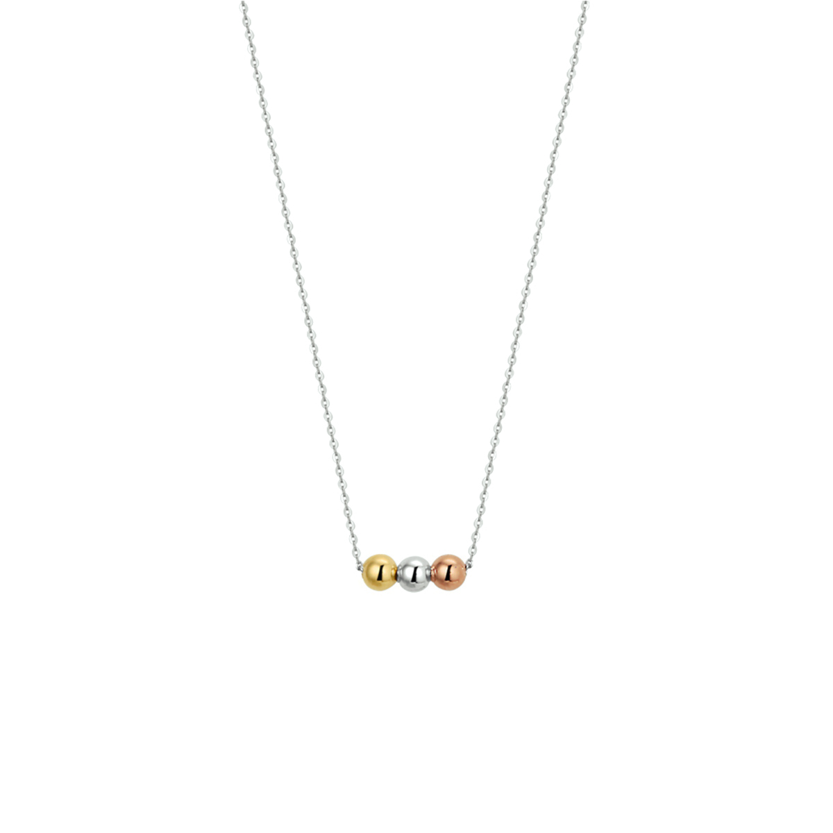 Trendy 14k tricolor geel-rose en witgouden anker collier met draaglengtes van 40, 42 en 44 cm uitgevoerd met drie bolletjes van 3mm en een karabijn sluiting. Door het simplistische model is dit collier gemakkelijk te combineren met andere sieraden uit onze collectie of vanuit je eigen sieraden stash!. INFO: Gerhodineerd zilver is door de rhodiumlaag beter bestand tegen verkleuren en krassen.
