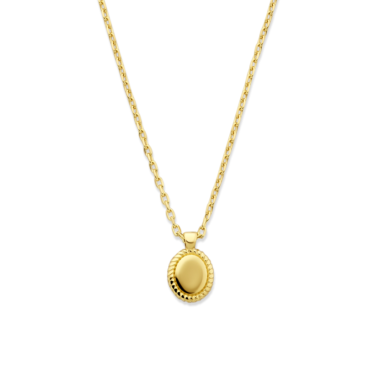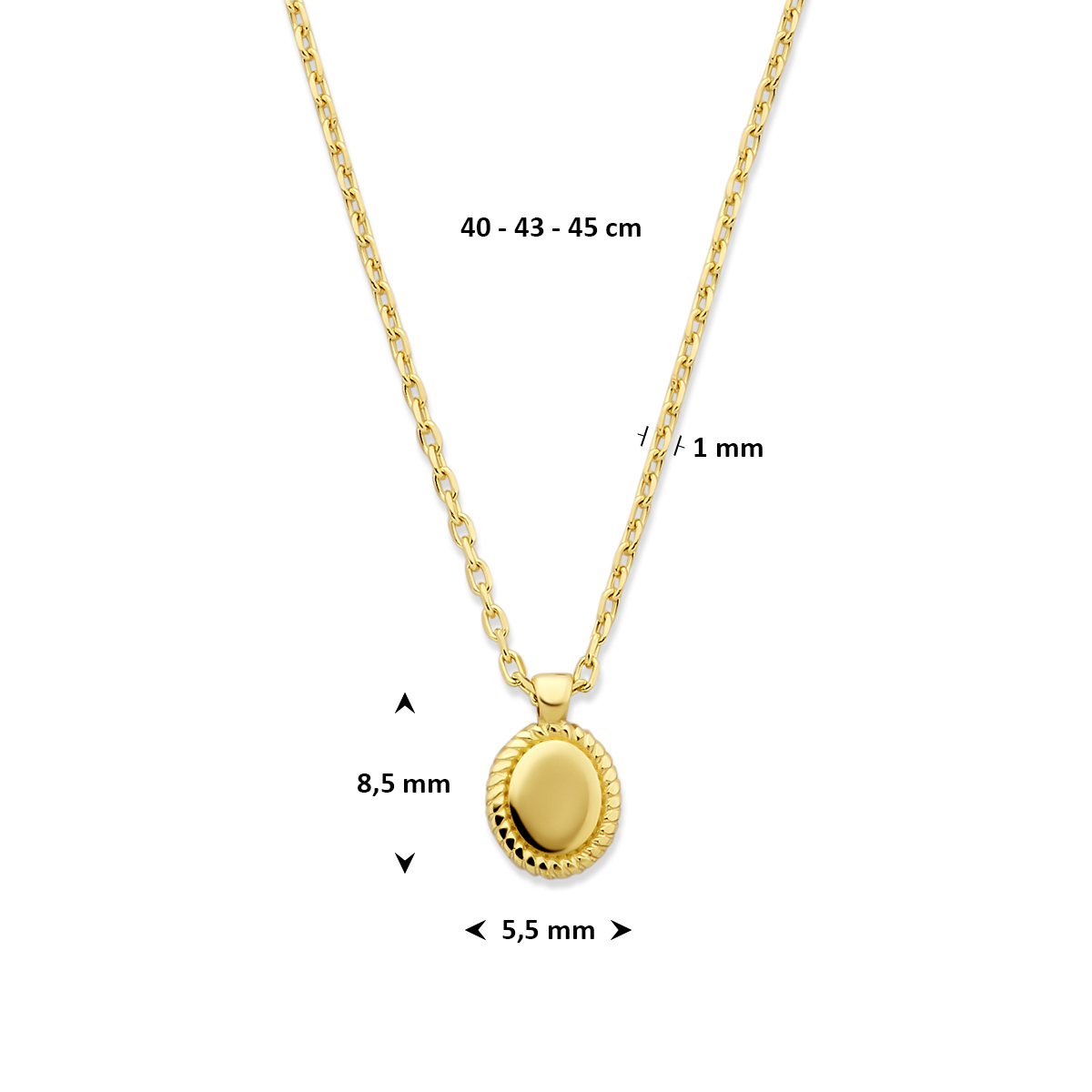 14k Geelgouden collier met draaglengtes van 41-43-45cm. Het collier heeft een schakelbreedte van 1mm. De hanger heeft een afmeting van 8.5×5,5mm.