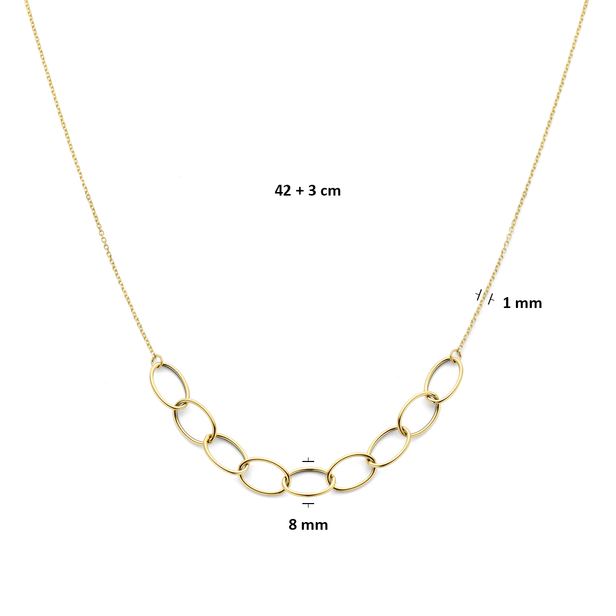 14k Geelgouden collier met een schakelbreedte van 8mm en een draaglengte van 42+3cm. Uitgevoerd met karabijnsluiting.