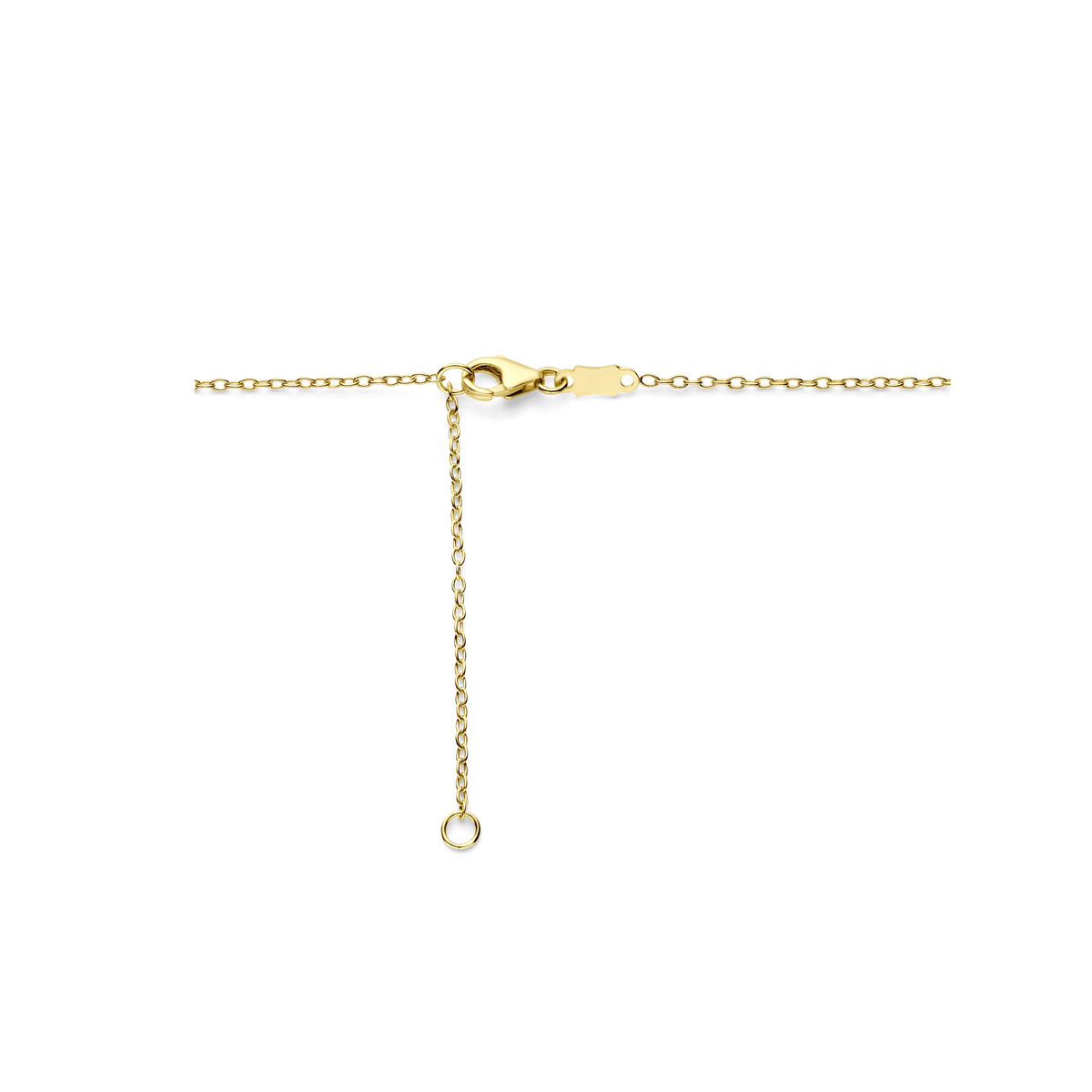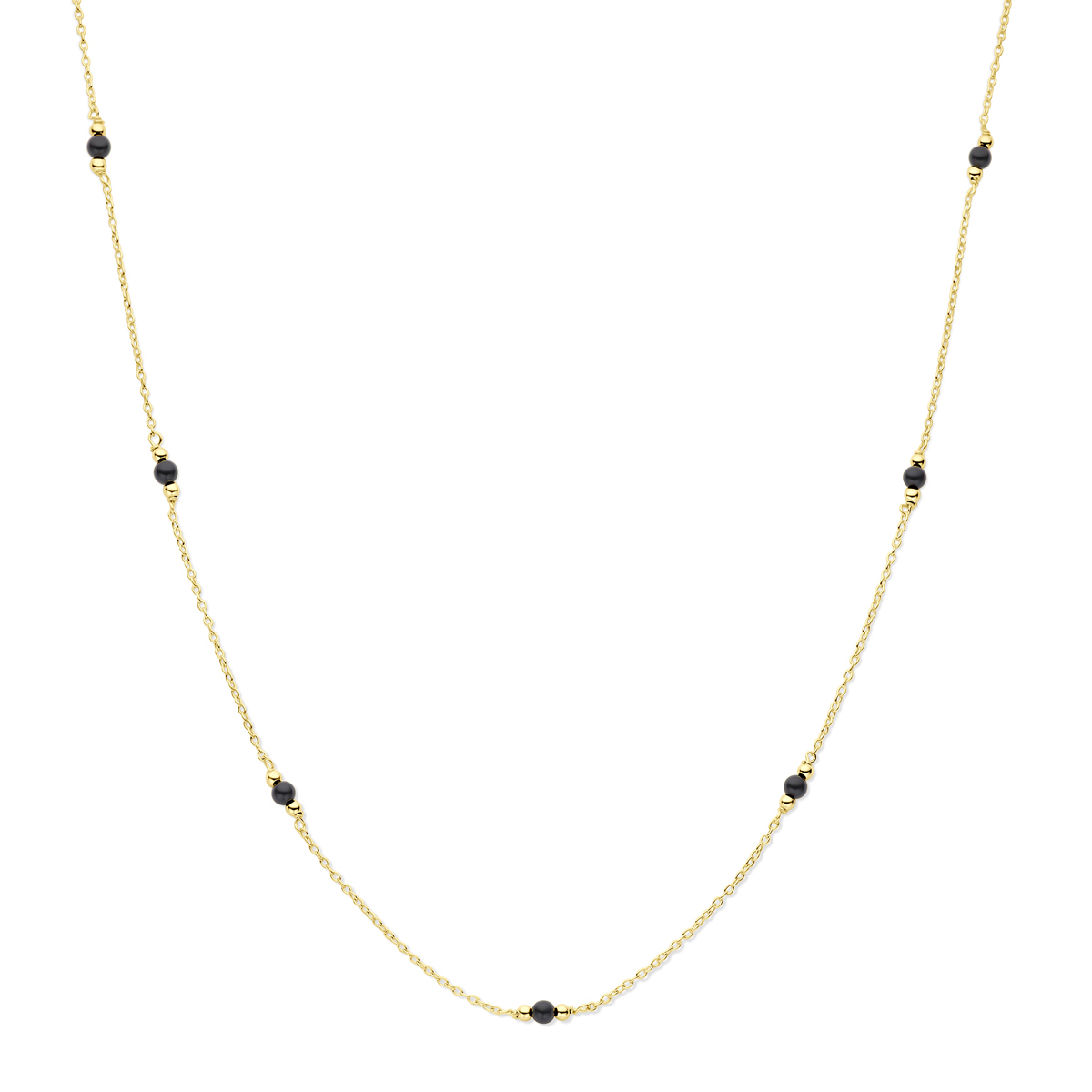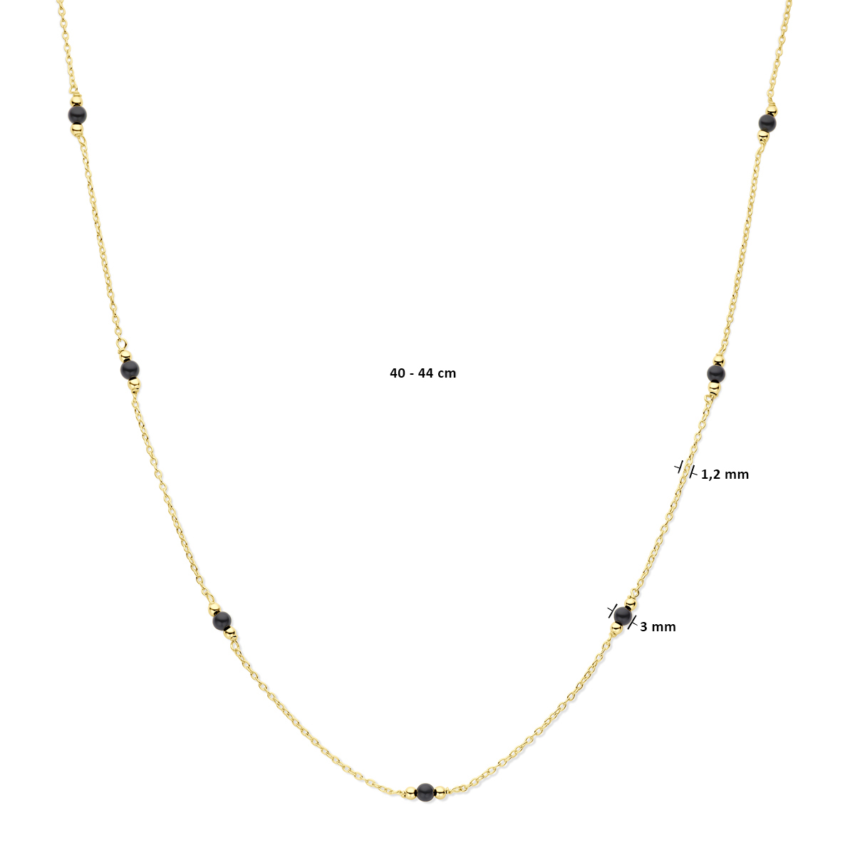 14k Geelgouden collier uitgevoerd met bolletjes en onyx. Het collier heeft een schakelbreedte van 1.2mm. Uitgevoerd met een karabijn sluiting.