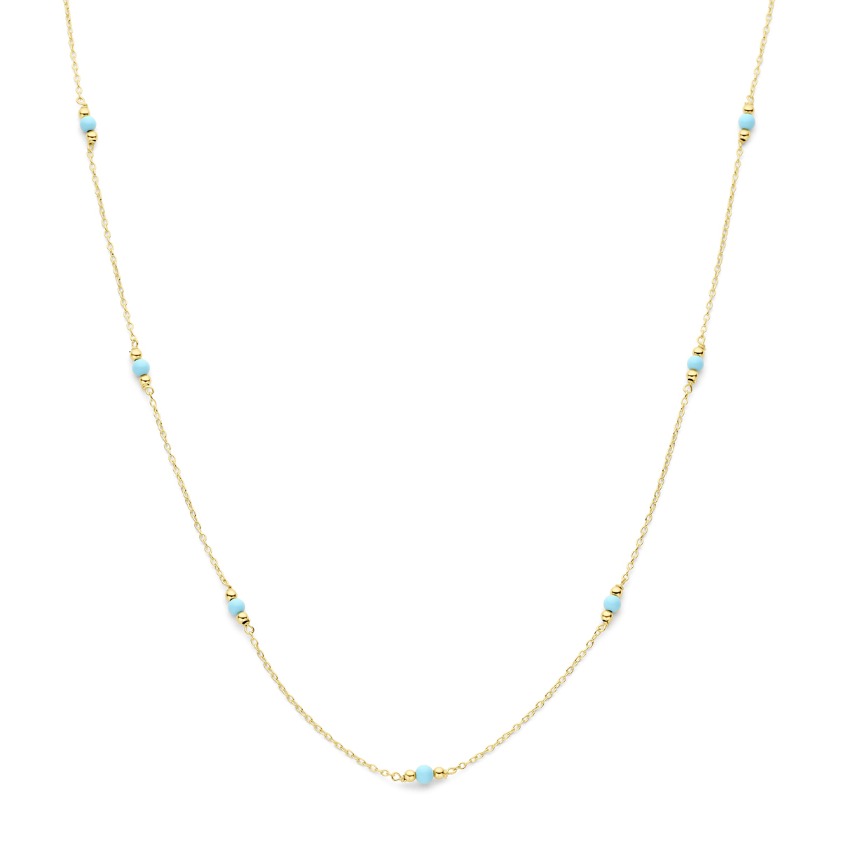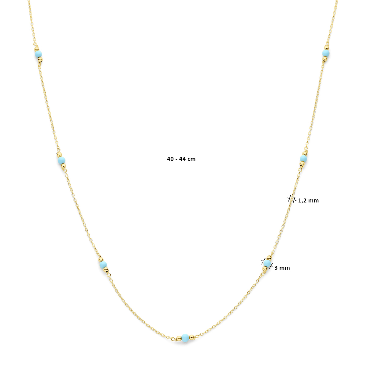 14k Geelgouden collier uitgevoerd met bolletjes en turquoise. Het collier heeft een schakelbreedte van 1.2mm. Uitgevoerd met een karabijn sluiting.