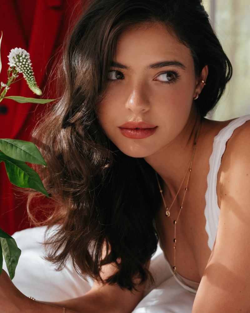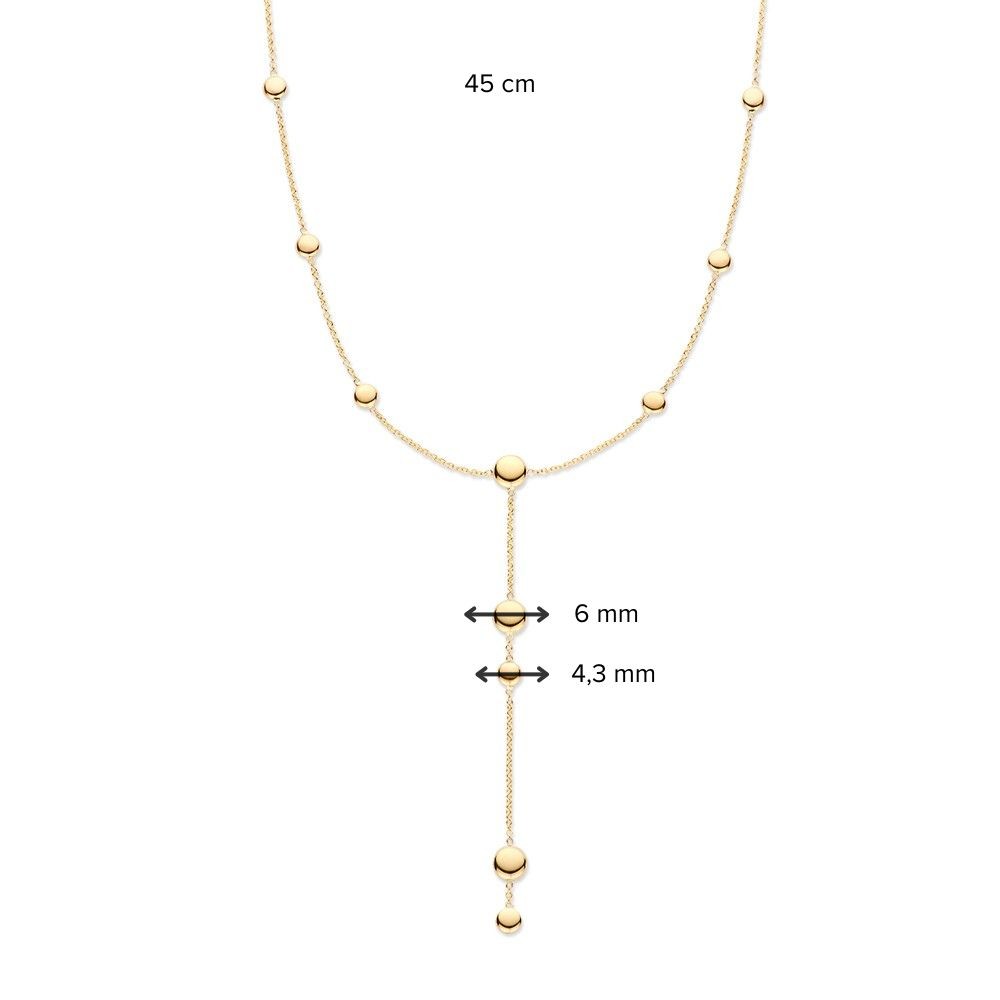 Geelgouden y-collier met gouden pilletjes in verschillende groottes.