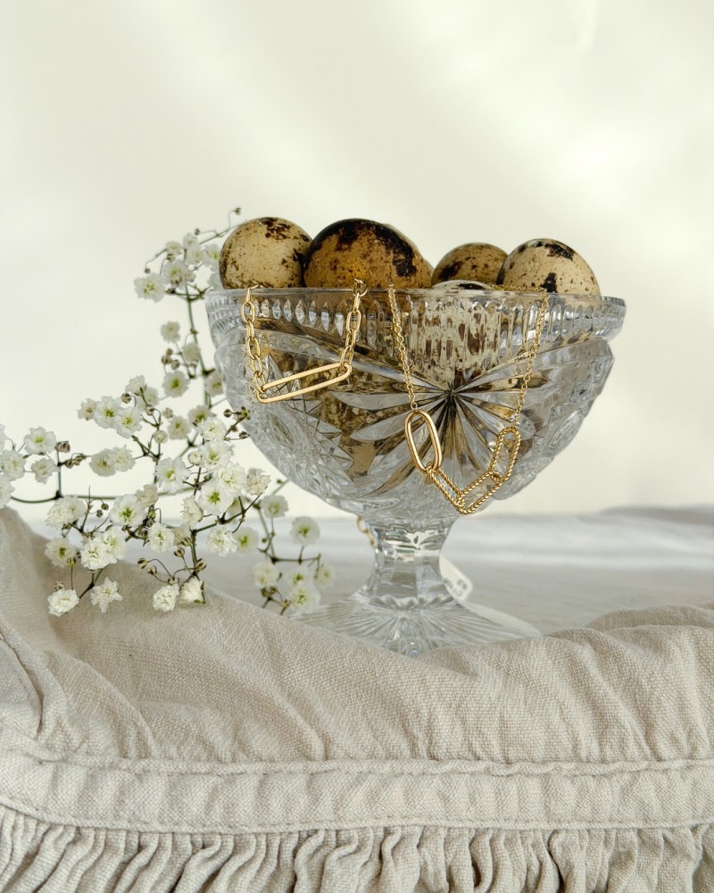 Speels, geelgouden collier met paperclipschakels met een getorste bewerking.