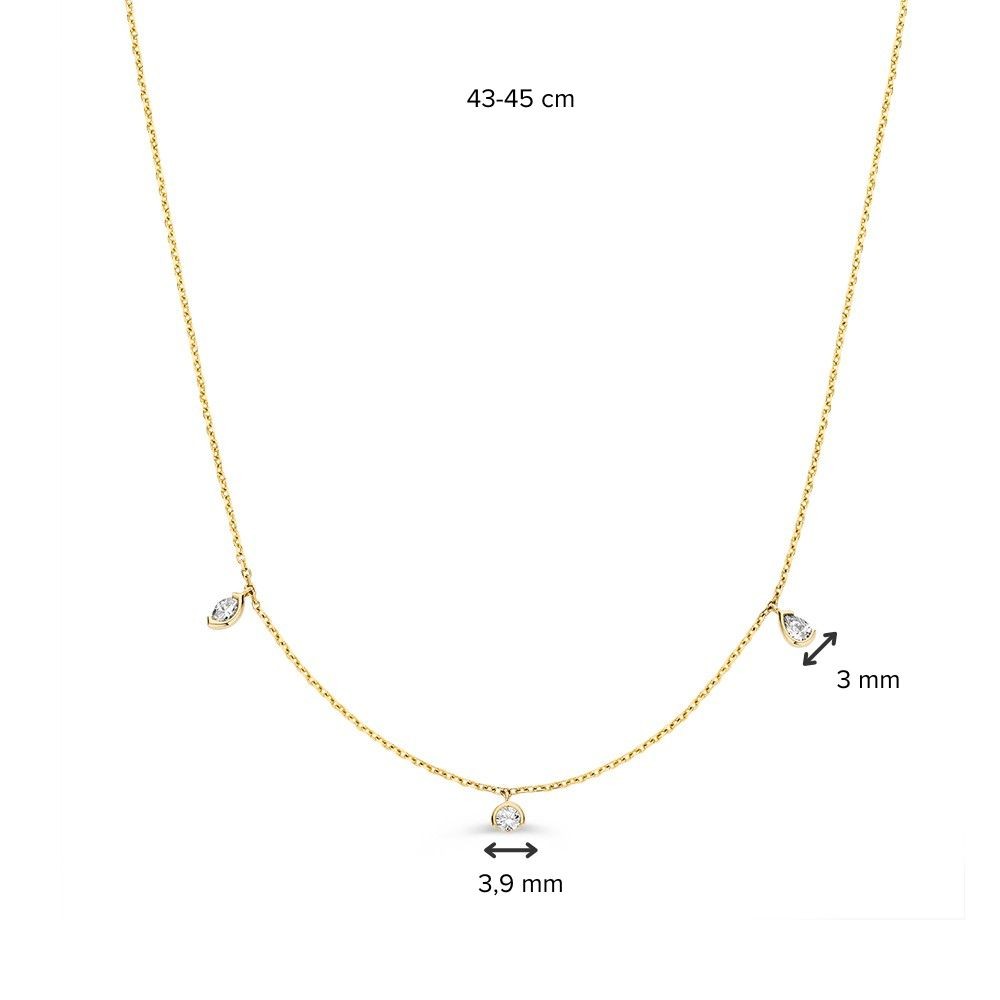 Verfijnd en speels collier met drie diamanten in open bezel zetting, de diamanten hebben ieder een eigen slijpvorm: briljant, markies en peer.