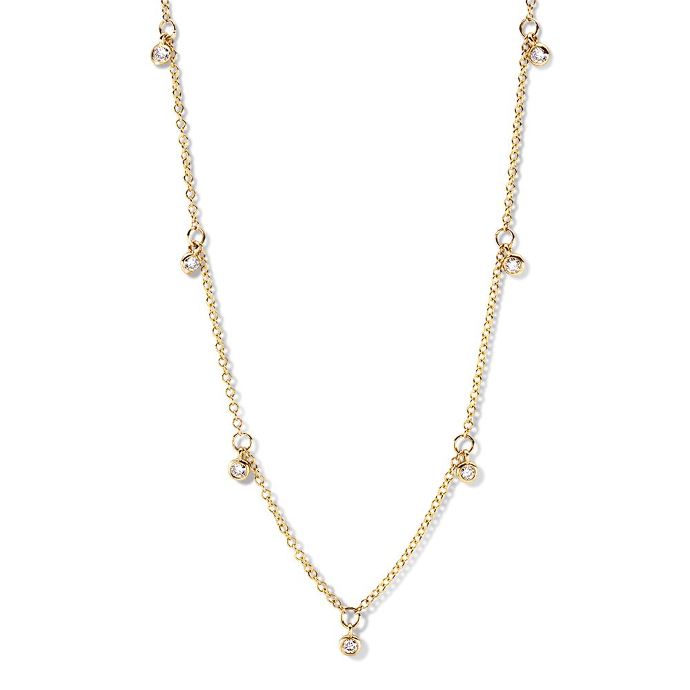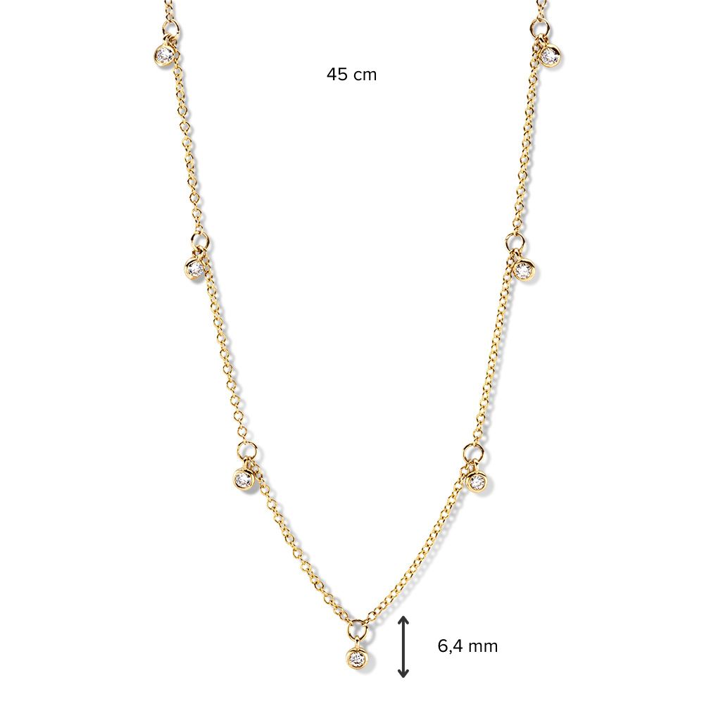 Schitterend geelgouden collier met vijf dansende diamanten.