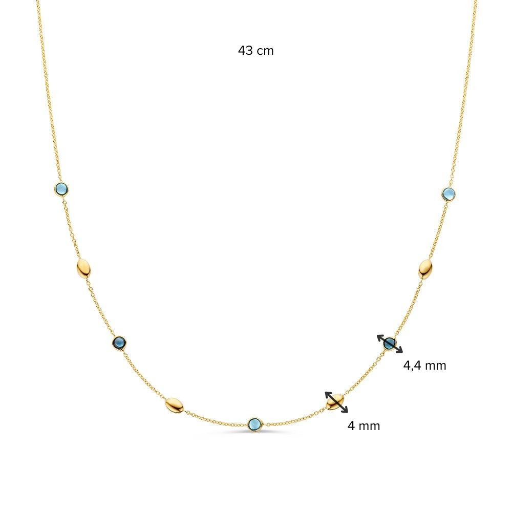 Verfijnd, geelgouden collier met cabuchon geslepen, blauwe topazen en london blue topazen.